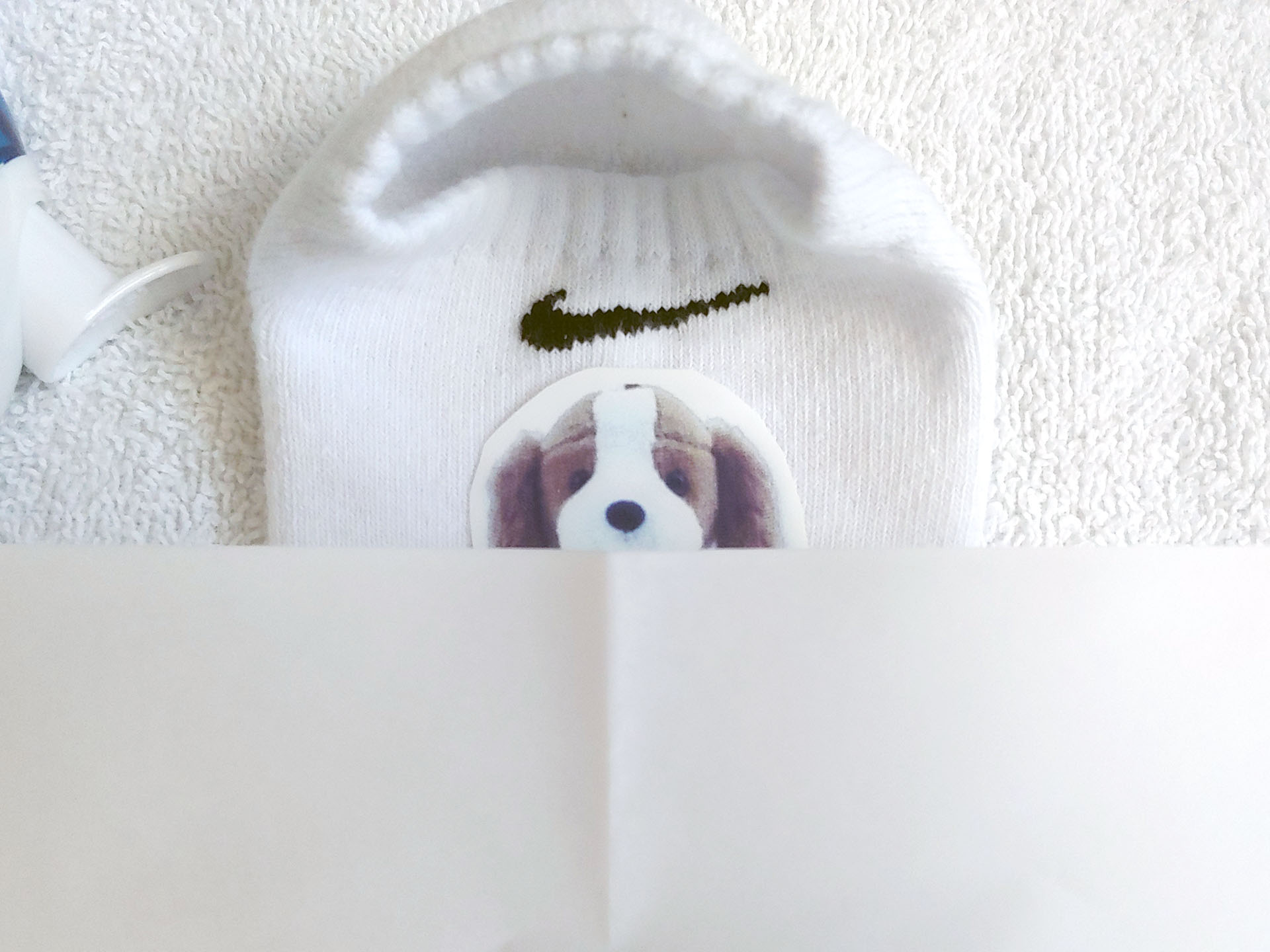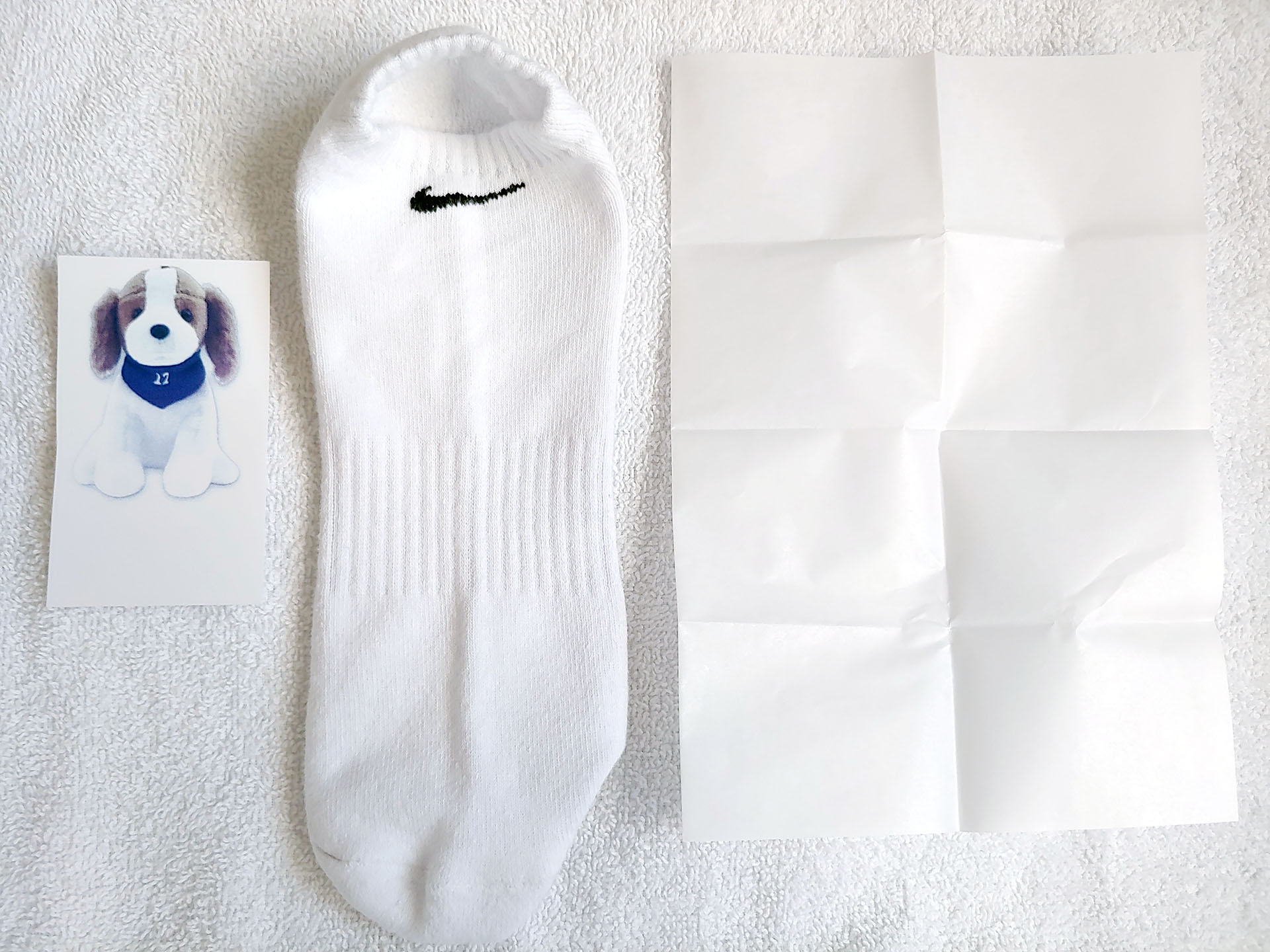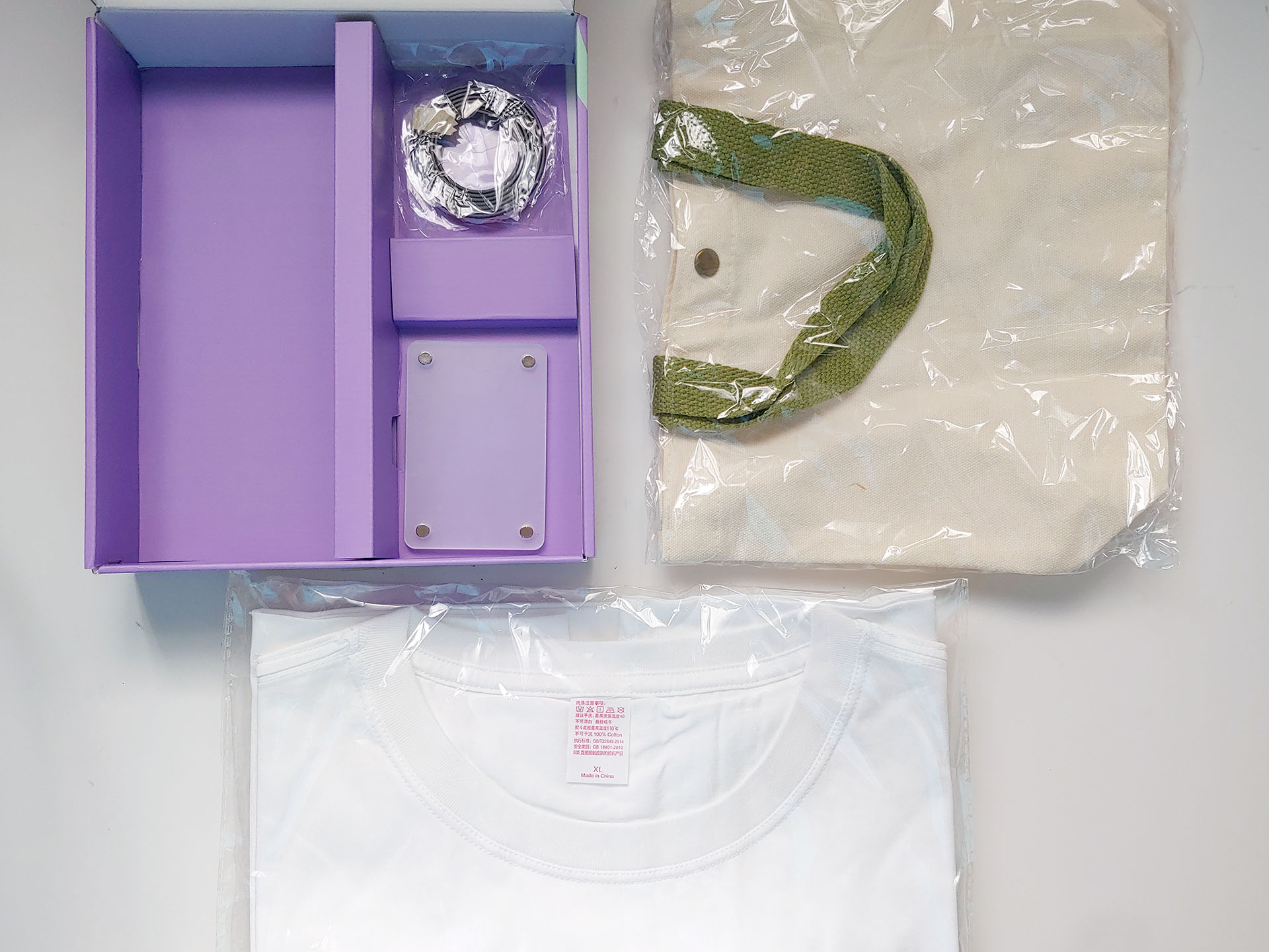 我们提供了一套样品,其中包括一件白色 T 恤、手提包、磁性相框和柔性磁铁。