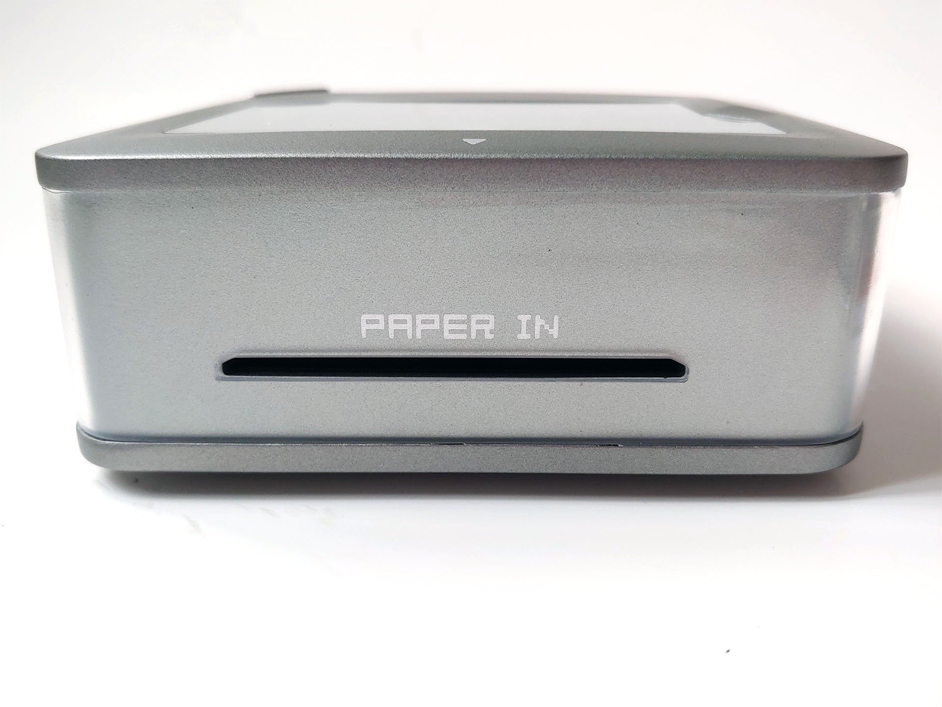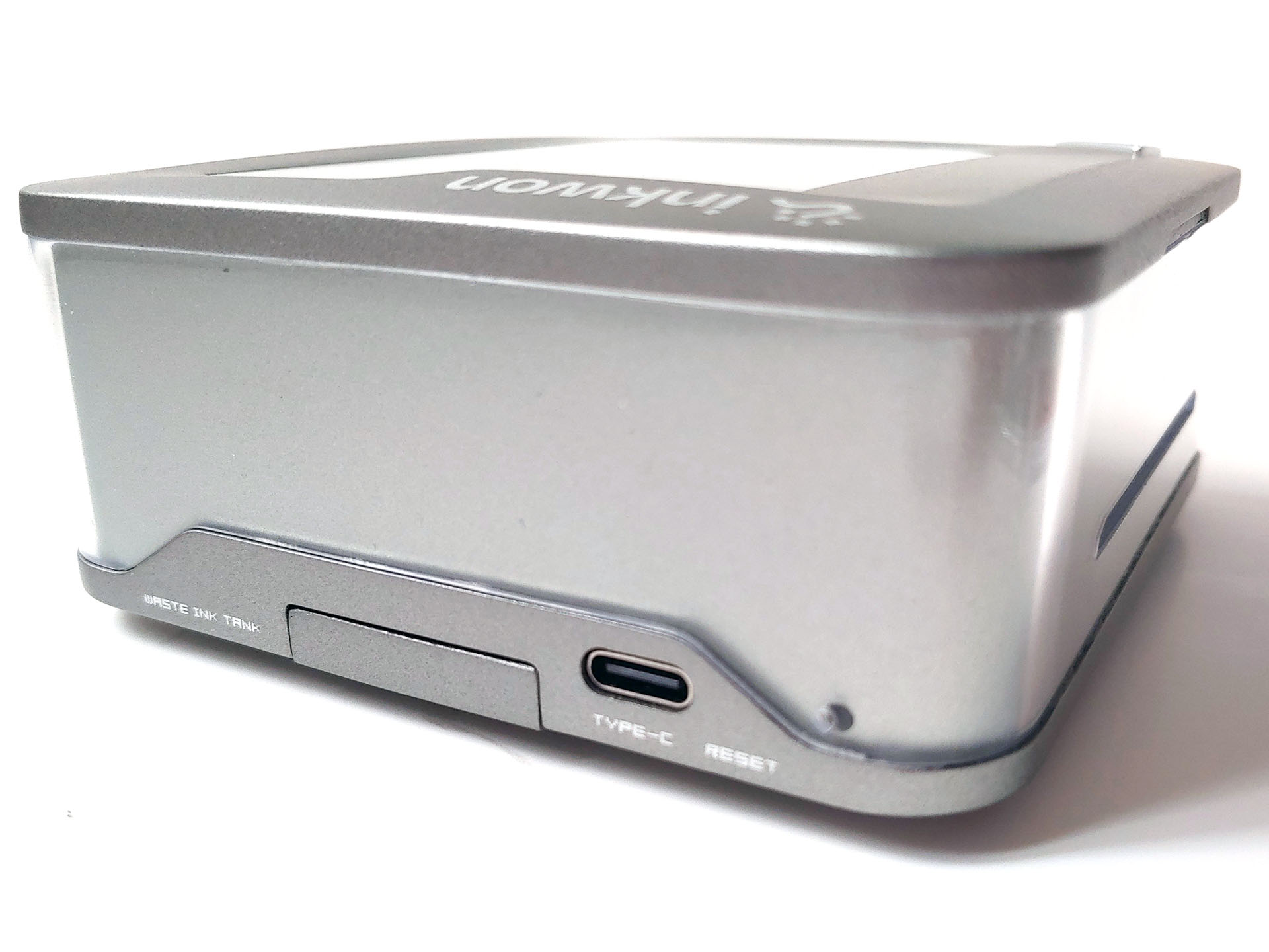相对的纸槽可处理自动进纸,另一侧有复位孔、USB-C 端口和废墨水盖。这款小巧的打印机可轻松放入大外套口袋或小包中。