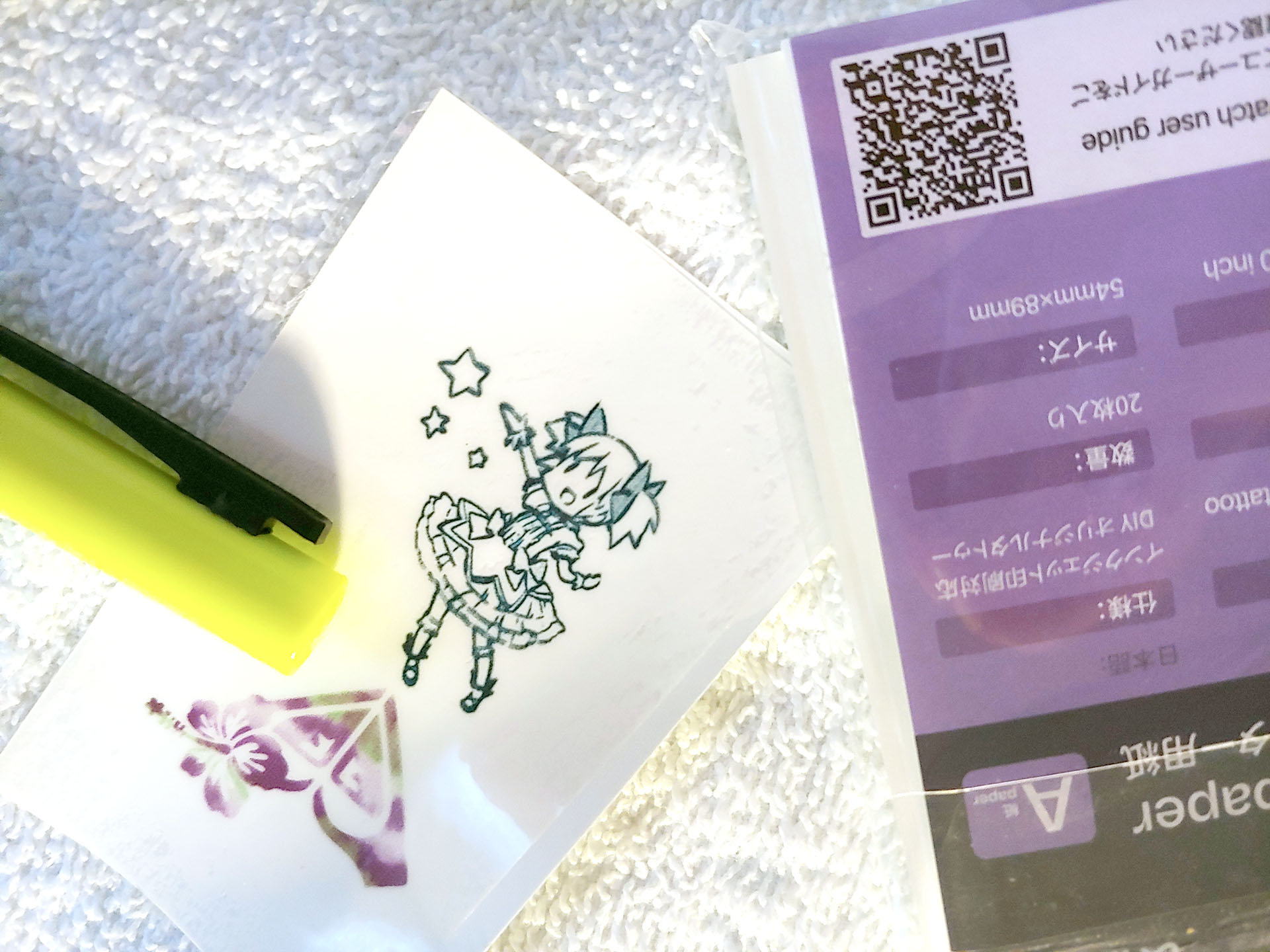 将透明胶片贴在纹身印花上,揉搓以去除气泡,修剪后剥离透明胶片。