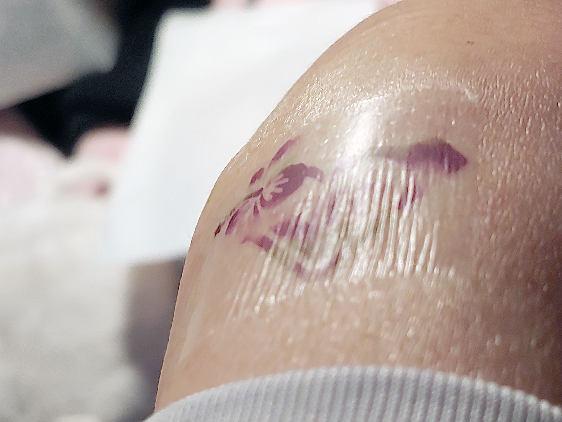 纹身保留了原始印刷品的质量和颜色。透明表层使纹身看起来有光泽,而且不像皮肤那样具有伸缩性,因此弯曲时会产生轻微的波纹。纹身具有防水性,但不防水,用热肥皂洗澡会破坏粘合剂。