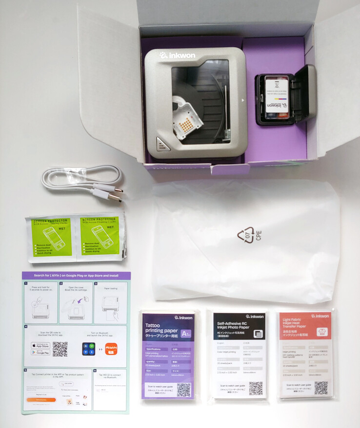 包装盒中包括 Inkwon Tag 打印机、快速入门指南、USB-C 充电线、喷墨墨盒和墨盒架、喷头清洁布以及一套胶纸、纹身纸和转印纸。
