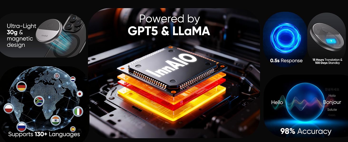 据该公司称,该翻译器由 GPT-5和 InnAIO 的语言模型,支持 130 多种语言。InnAIO 称,该设备的翻译速度为 0.5 秒,准确率高达 98%。