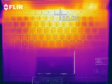 在空闲运行期间,这台13英寸的笔记本电脑保持凉爽,我们测量的平均温度只有28ºC(82ºF)。在高负荷下("Witcher 3")--在GPU节流的情况下--产生的平均温度为37ºC(99ºF ),有些地方达到52ºC(126ºF)。