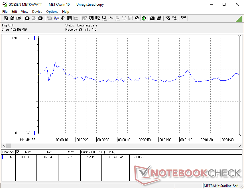 当 CPU 和 GPU 的利用率达到 100% 时,我们可以测量到中等尺寸(约 15 x 7.4 x 2.5 厘米)的 130 W AC 适配器的临时最大功耗为 138 W。请注意,没有独立显卡的配置配备的是较小的 90 瓦交流适配器。