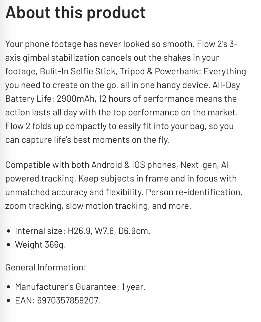不出所料,Argos UK 已将其列表从公众视图中删除。不过,通过 Bing 仍可找到缓存版本。作为参考,该零售商称 Flow 2 具有三轴云台稳定功能,配备 2900 毫安时电池,续航时间长达 12 小时。
