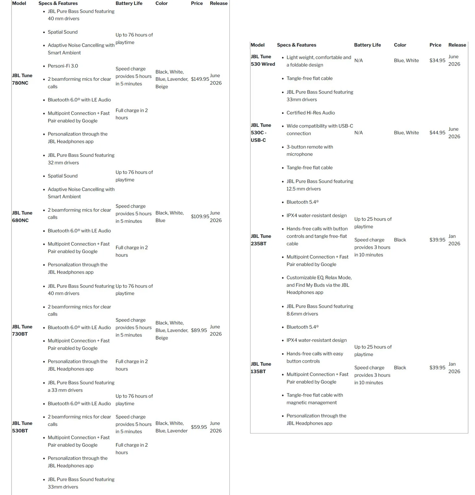 JBL 在 CES 上发布了 2026 年的八款 Tune 耳机型号:780NC、680NC、730BT、530BT、530 Wired、530C - USB-C、235BT 和 135BT,可分为四类。