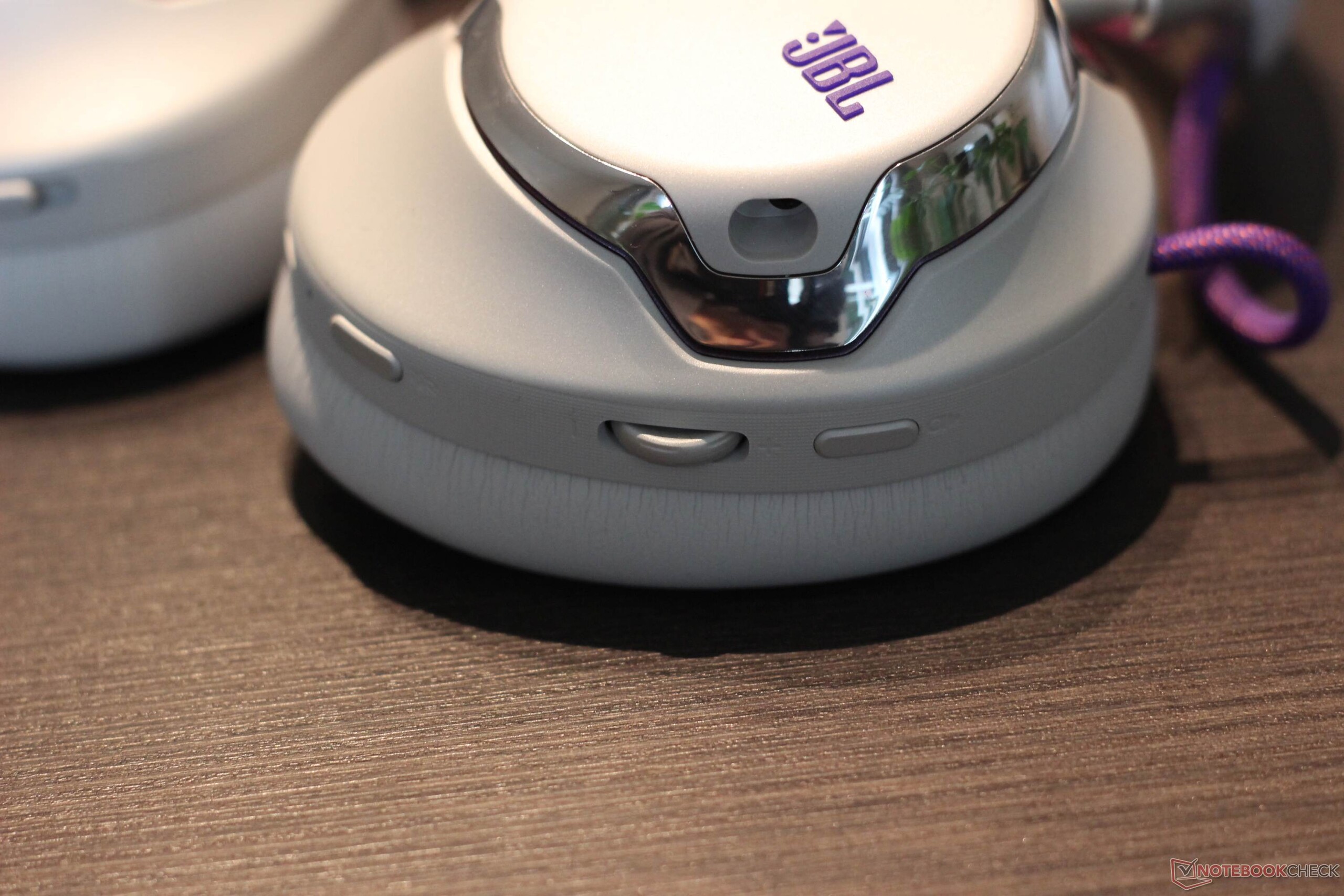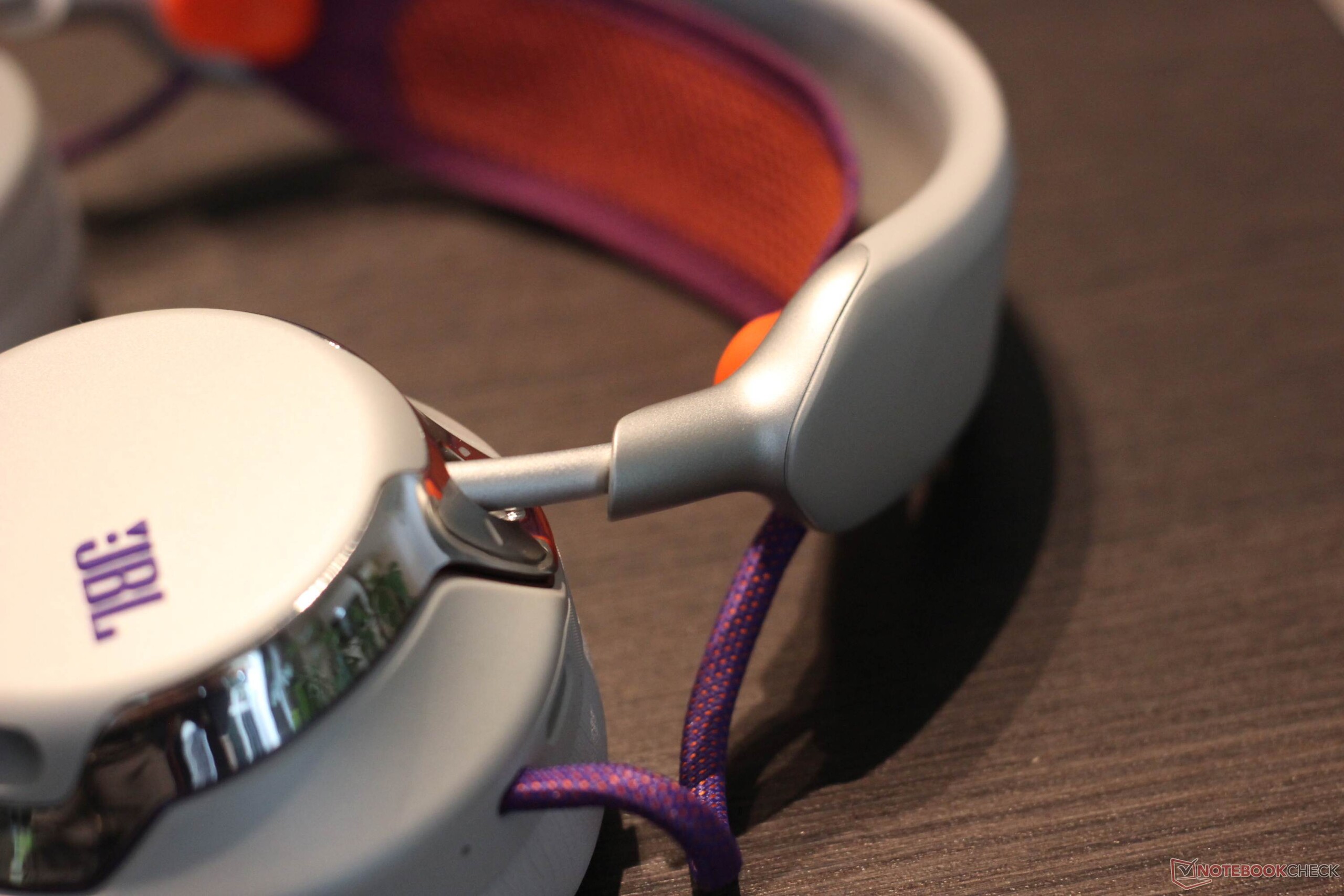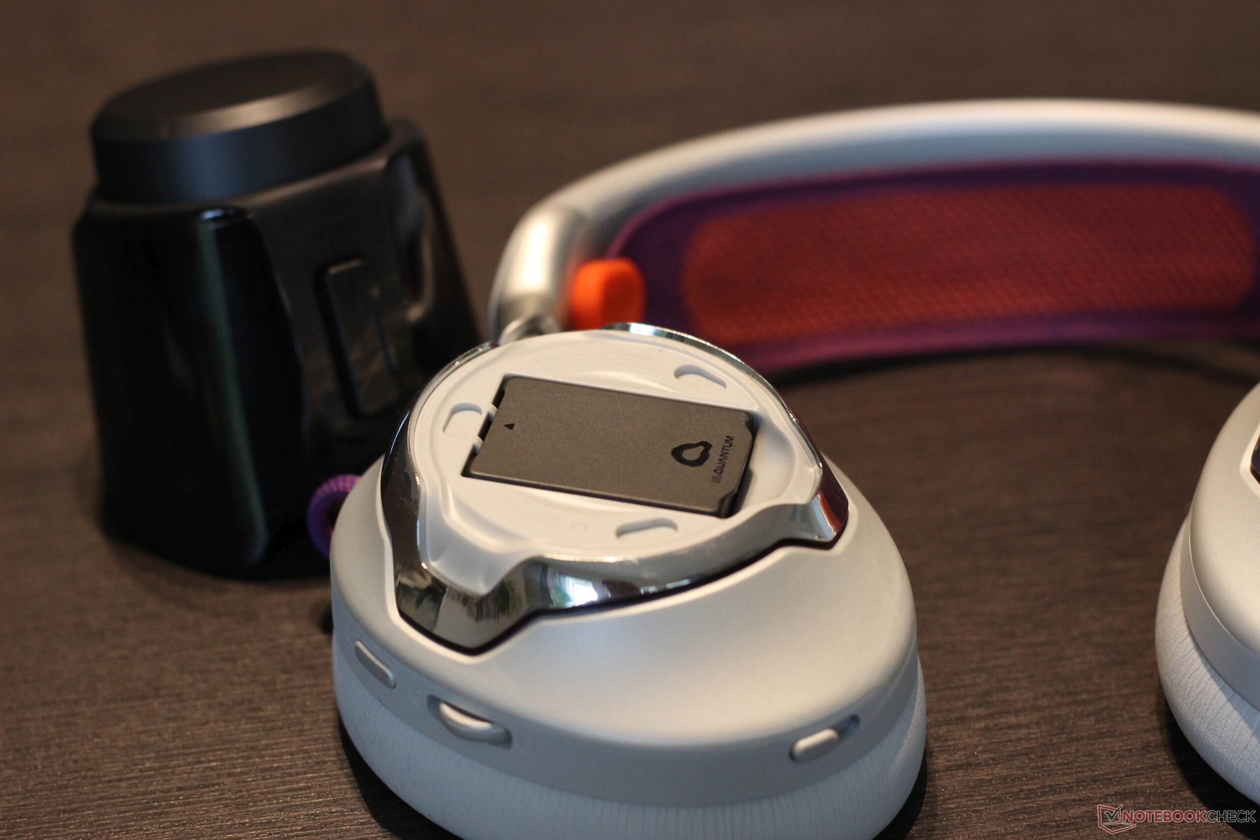 JBL Quantum 950 Wireless 随附一系列配件。其中包括一个可通过 USB C 型连接的基站。它具有多种功能:它不仅可以充当 2.4 GHz 加密狗,还可以充当控制装置和充电站,为随附的两块可充电电池中的一块充电。此外,还包括一个吊杆麦克风和一个校准专用麦克风。另外还附带了一个非常实用的布袋。耳机本身带有金属装饰、三个按钮、两个旋转控制按钮和一个滑块。按键提供了一个舒适的压力点。耳机本身的金属色装饰设计非常醒目,材料也使用了金属。耳垫通过磁力固定到位,易于更换。头带本身由网状织物制成,也可以更换,这通常是一个非常积极的特点。电池也是如此,可以轻松更换。不出所料,金属色表面有点容易沾染指纹。白色型号版本在对比度方面毫不吝啬。头带为紫色和橙色,线缆和 JBL 标志也非常醒目。