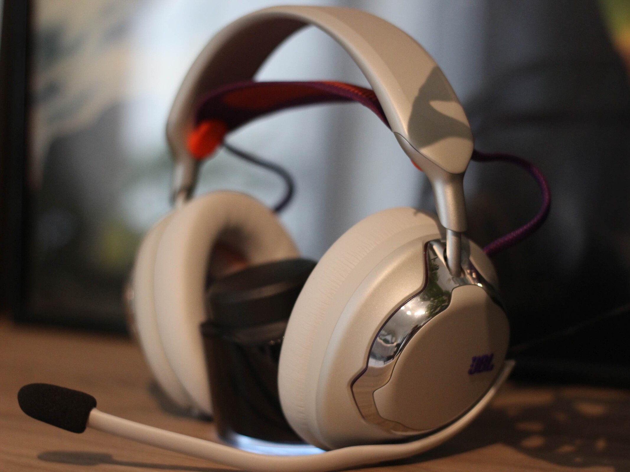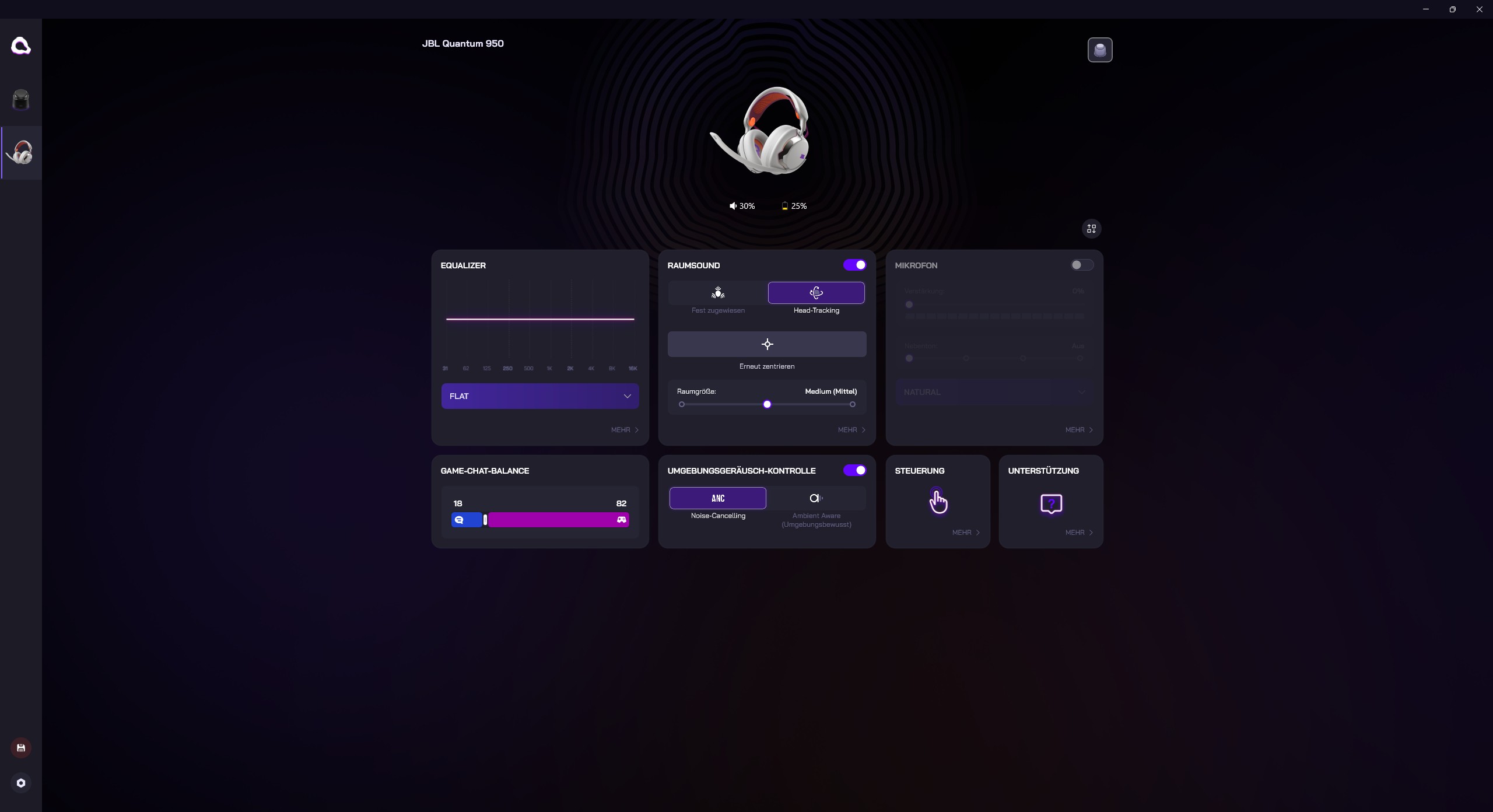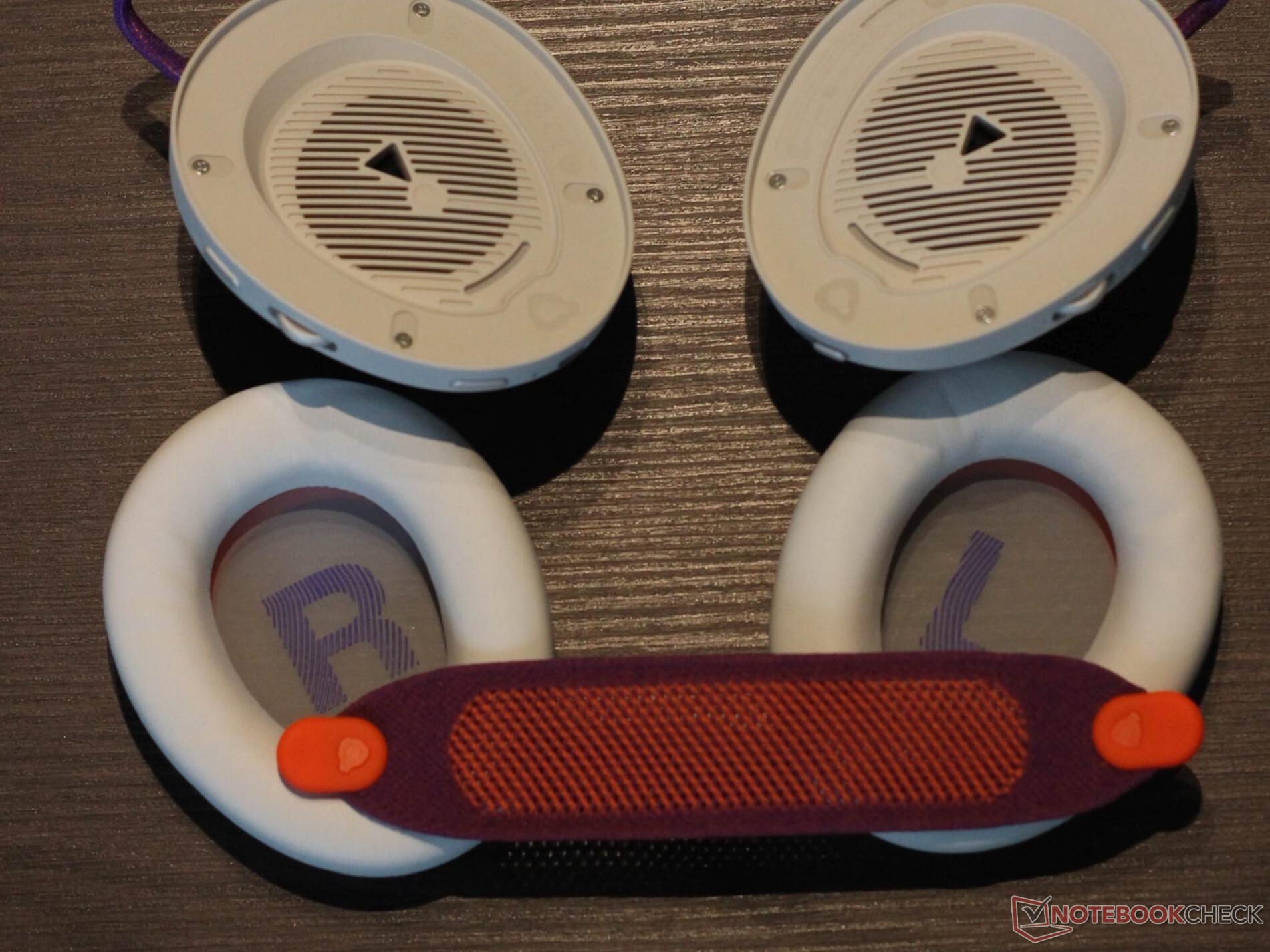 JBL Quantum 950 Wireless 随附一系列配件。其中包括一个可通过 USB C 型连接的基站。它具有多种功能:它不仅可以充当 2.4 GHz 加密狗,还可以充当控制装置和充电站,为随附的两块可充电电池中的一块充电。此外,还包括一个吊杆麦克风和一个校准专用麦克风。另外还附带了一个非常实用的布袋。耳机本身带有金属装饰、三个按钮、两个旋转控制按钮和一个滑块。按键提供了一个舒适的压力点。耳机本身的金属色装饰设计非常醒目,材料也使用了金属。耳垫通过磁力固定到位,易于更换。头带本身由网状织物制成,也可以更换,这通常是一个非常积极的特点。电池也是如此,可以轻松更换。不出所料,金属色表面有点容易沾染指纹。白色型号版本在对比度方面毫不吝啬。头带为紫色和橙色,线缆和 JBL 标志也非常醒目。