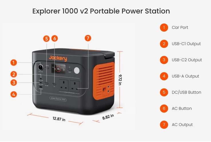 Explorer 1000 v2 重 23.8 磅(10.8 千克),尺寸为 12.87 x 8.82 x 9.72 英寸(32.7 x 22.4 x 24.7 厘米),比以前的型号小 18%。该设备有一个家用交流输入端和一个 12V 汽车充电输入端。两个 8 毫米直流输入可用于太阳能电池板充电。电站有多个输出端,包括两个 1500 瓦交流电输出端、一个 18 瓦 USB-A 输出端、一个 30 瓦 USB-C 输出端和一个 100 瓦 USB-C 输出端,可为家用或外出常用电子产品和电器供电。内置冷却风扇的噪音低于 22 分贝,运行时几乎没有噪音。