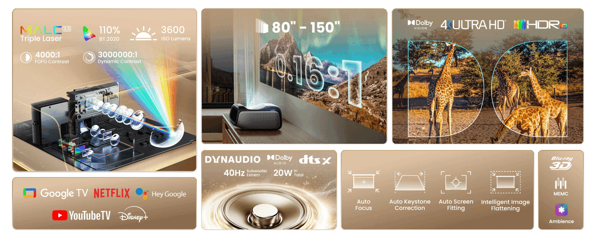 Jmgo 在 O2S Ultra 中采用了其专有的 MALC 3.0 三激光系统,据说可以提供明亮锐利的 4K 图像,同时覆盖 110% 的 BT.2020 色域。此外,它开箱即可运行 Google TV,并可访问 Netflix、YouTube、Amazon Prime、Hulu、Disney+ 等各种流媒体服务。此外,它还支持 Google Assistant 语音命令和通过智能手机进行 Google Cast 无线传输。