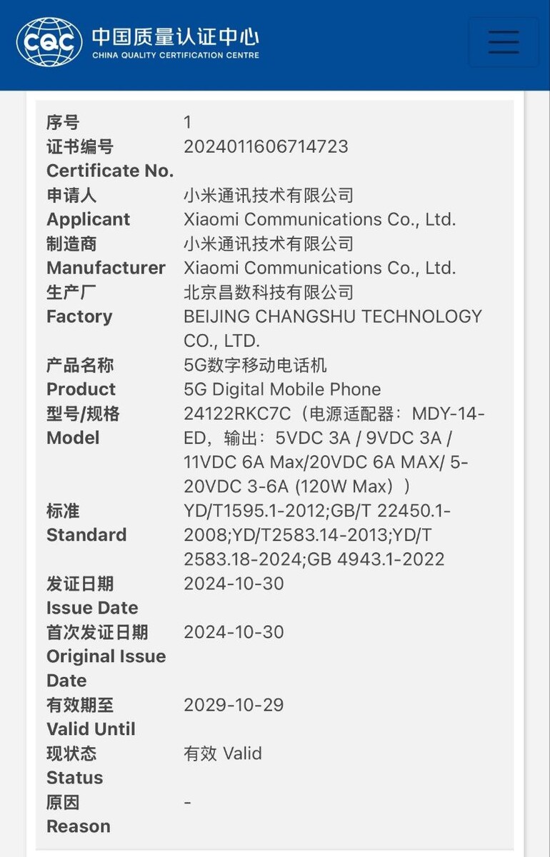 正如下面的截图所示,小米一口气认证了三款智能手机。这一次,该公司似乎将很快发布 24117RK2CC、24127RK2CC 和 24122RKC7C,它们的有线充电速度都相对较高。具体来说,后两者的额定功率高达 120 W,而 24117RK2CC 的有线充电功率仅为 90 W。