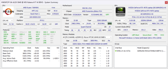 | MSI Katana A17 AI B8VG AMD Ryzen 7 8845HS ⎘ NVIDIA GeForce RTX 4070 Laptop GPU ⎘ 32 GB Memory, 1024 GB SSD | Amazon: $2,079.00 List Price: 1400 USD | 2.7 kg | 25.2 mm | 17.30" 1920x1080 127 PPI IPS | |