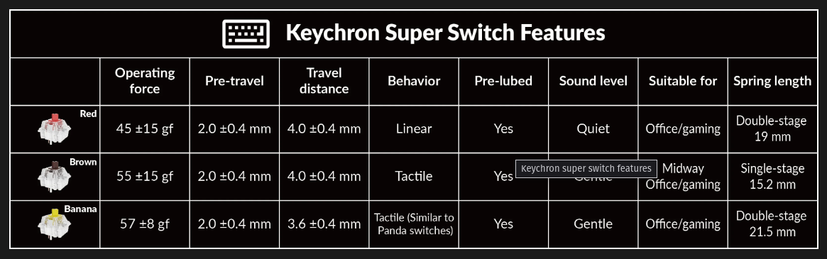 无论您购买的是哪款产品,都可以选择 Keychron Super Red(线性)、Brown(轻微触感)或 Banana(早期、尖锐触感凸起)。虽然这些开关都以 Keychron 命名,但它们似乎是 Gateron 生产的开关,因为它们的规格相同。