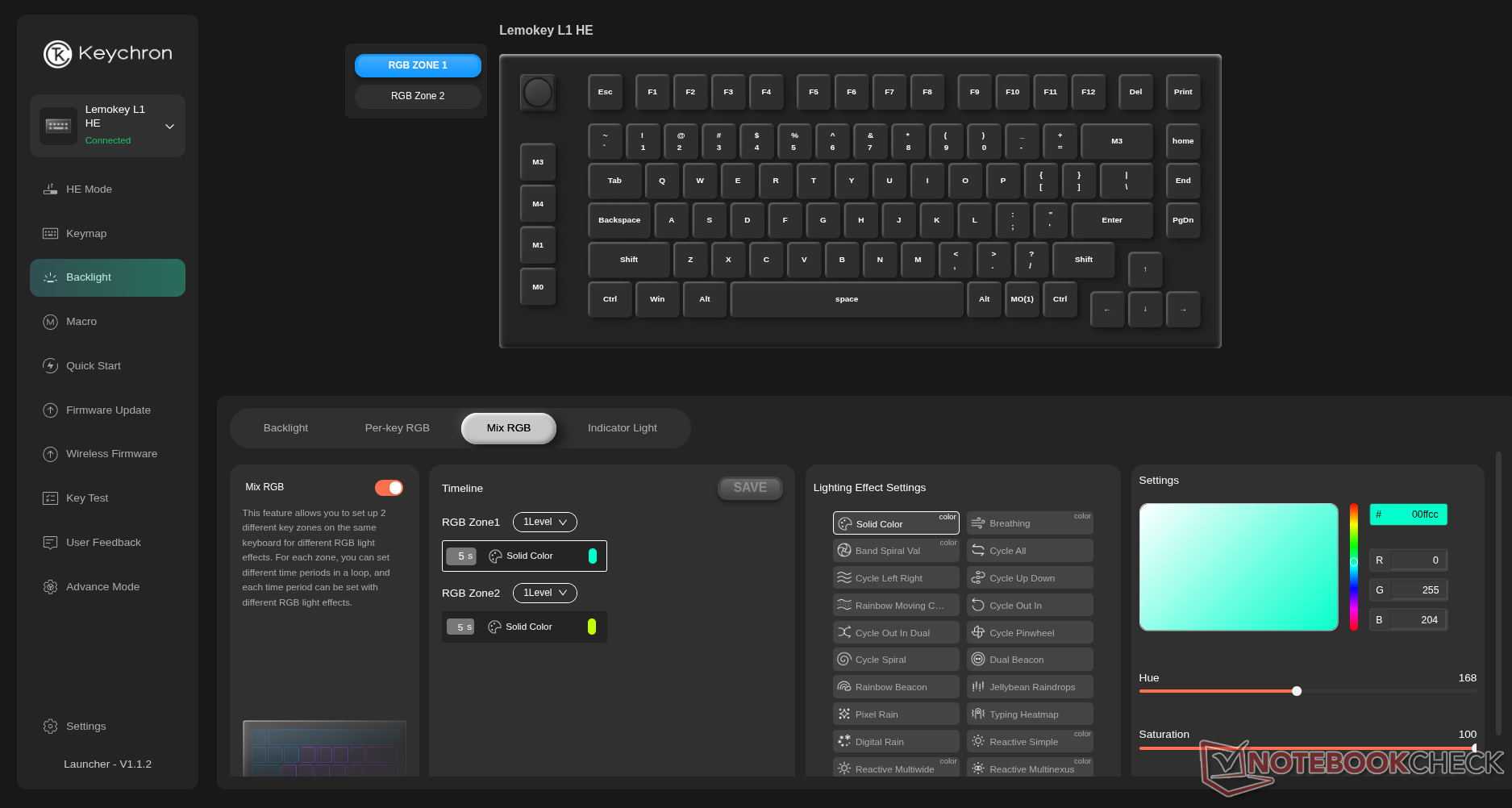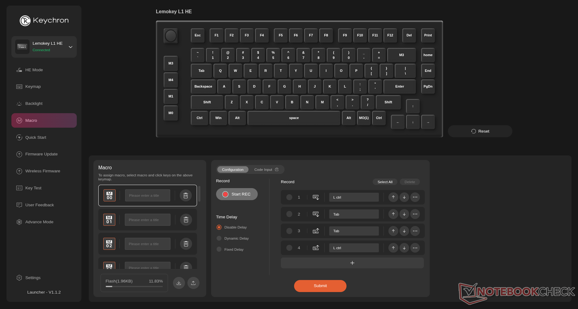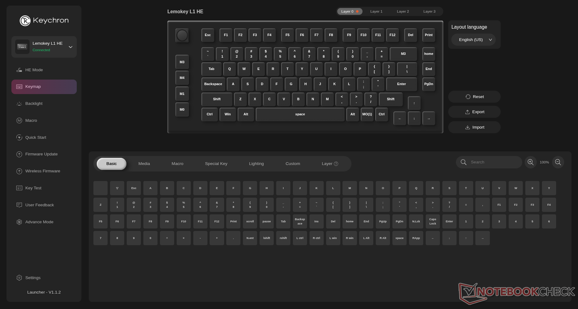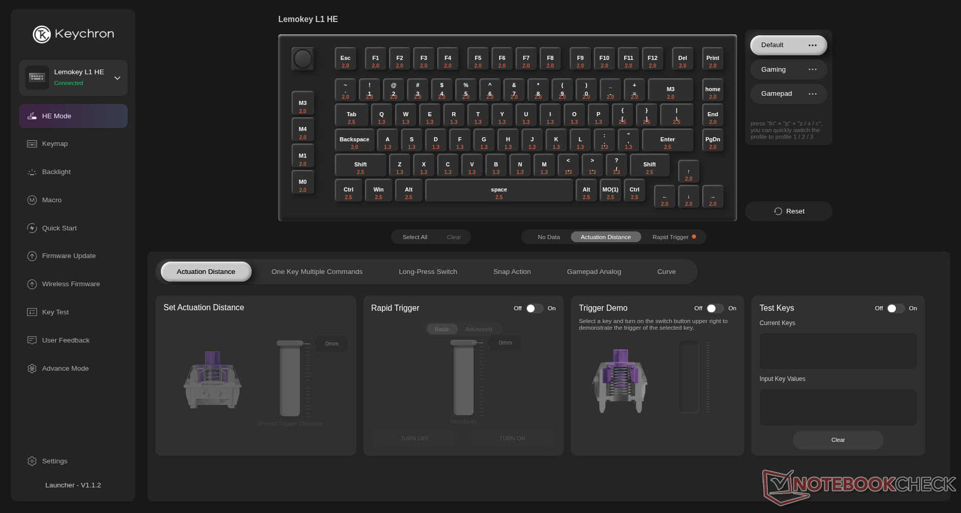 通过 Keychron 或 Lemokey Launcher(这两个网络驱动程序在功能和布局上完全相同)进行的自定义非常出色,包括真正的按键 RGB 自定义、宏自定义,以及我们对 Keychron 游戏键盘所期待的所有花哨的霍尔效应功能--致动距离、快速敲击、DKS、快速触发,甚至是模拟手柄的模拟模式。与往常一样,Keychron 是少数几个提供后者的品牌之一。 Wooting.奇怪的是,我们的评测设备出现了故障,导致启动器显示屏上的按键无法反映键盘上正确显示的 RGB 背光设置。这可能是我们的设备出现了问题,也可能是固件出现了错误,我们会加以解决。无论如何,只要在应用设置时查看键盘,就能轻松解决这个问题。