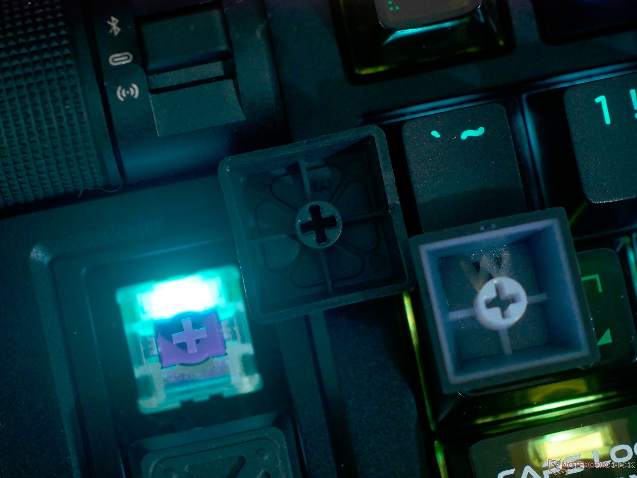 同样,键帽和配件包的质量也很高。键帽上的字母在 RGB 背光的照射下非常均匀,主键帽上的纹理触感也很好。透明 PC 键帽表面光亮,可能会让某些人感到不舒服,但在我们的评测期间却很容易适应。