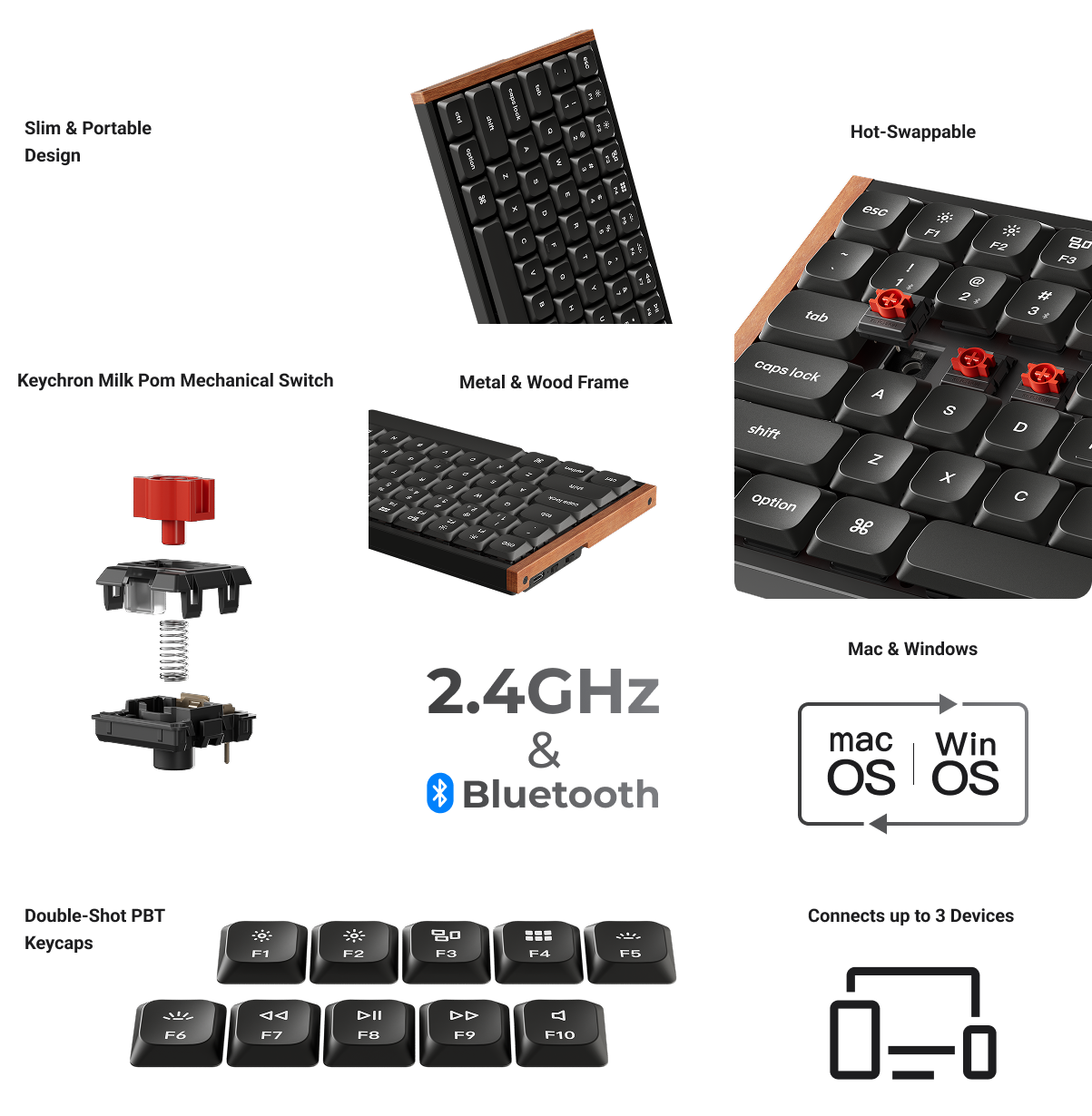 | 默认开关选项 | Keychron 牛奶 POM 红色(线性)、棕色(触感)、香蕉色(尖锐触感) | Keychron 超快石灰低剖面开关 |