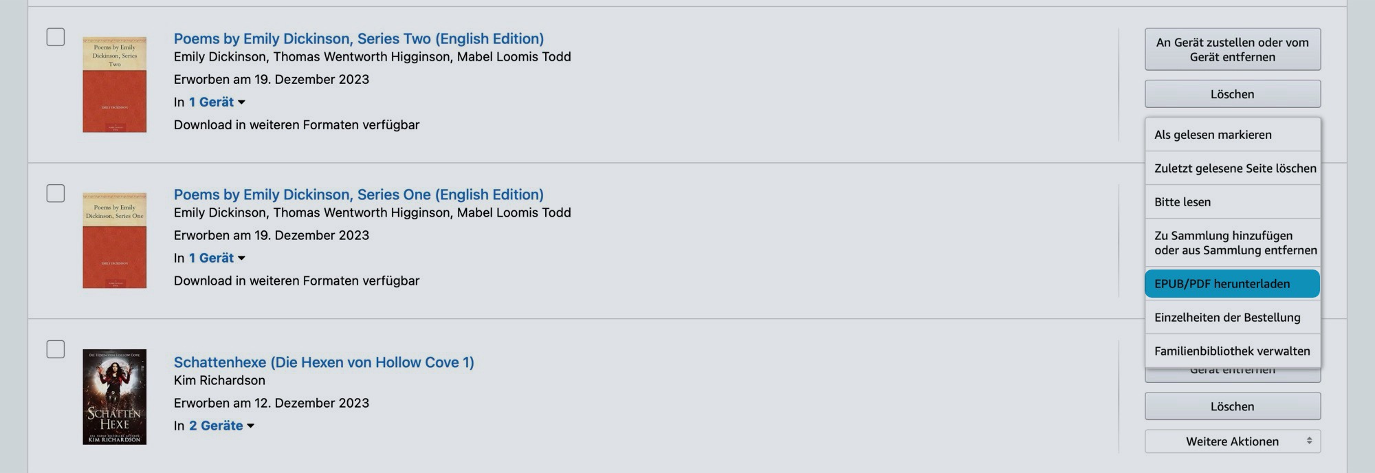 要下载电子书,请在亚马逊帐户的 "数字内容 "下选择该电子书。如果有无 DRM 版本,"更多操作 "下会出现 "下载 EPUB/PDF "选项。这样就可以在没有 Kindle 应用程序的电子阅读器上阅读图书。不带 DRM 的销售也意味着书籍理论上可以与朋友分享,这也是亚马逊让出版商选择提供带或不带 DRM 的书籍的原因。