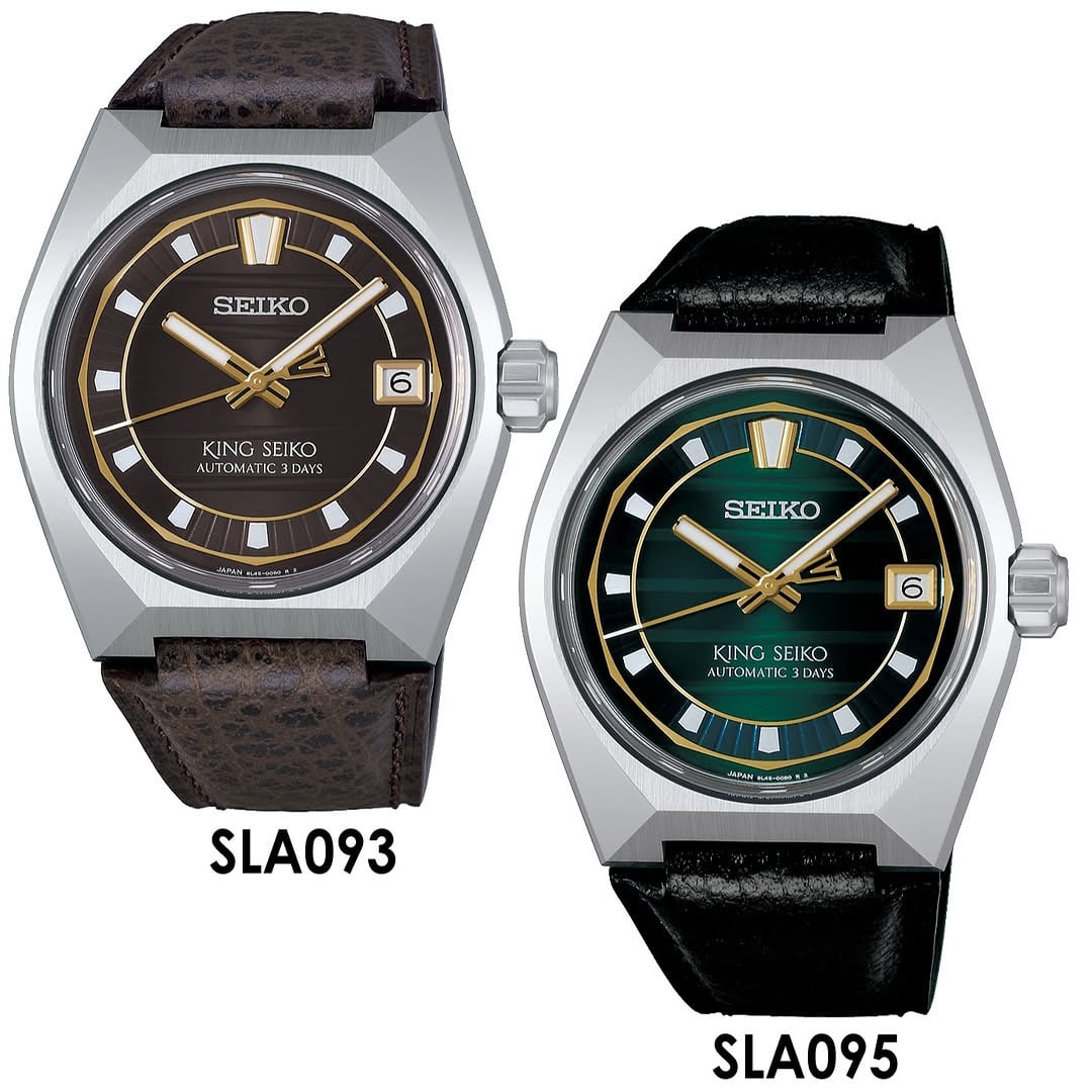 精工精工推出了两款 King Seiko Vanac 系列新表,表壳几何形状与早期表款棱角分明。这两款新表分别是 SLA093 和 SLA095,前者采用棕色表盘和金色刻度,后者则采用绿色表盘和金色刻度。两款手表均采用不锈钢表壳,尺寸为 41 × 14.3 × 45.1 毫米,详情请登录,由 @plus9time 共享。.
