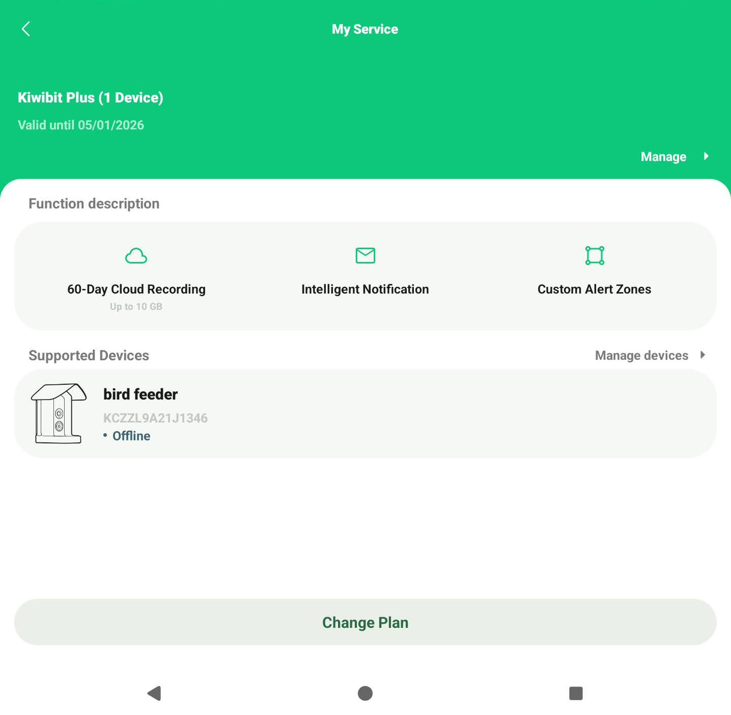 Kiwibit 提供了一个月的免费试用期,对于那些订阅了该服务的用户来说,它的各项功能都非常出色。人工智能的鸟类识别功能非常强大。它为鸟类访客建立了一个数字 "鸟书",在测试过程中,识别似乎非常准确,没有错误识别的鸟类。它能区分普通鸦雀和更有趣的访客,而不会出现廉价人工智能软件常见的幻觉。不过,该应用程序还需要更细致的控制。用户基本上被锁定在 Kiwibit 的操作方式上,对于那些没有支付包月费用的用户来说,该应用程序变得杂乱无章,影响了高品质硬件的使用体验。