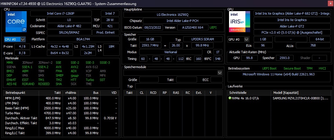 我们测试的模型(16Z900)价格为1300欧元,当然不是你在办公室领域找到的最便宜的交易。该设备配备了一个酷睿i7-1260P英特尔桤木湖一代的Core i7-1260P,16GB焊接的DDR5内存(5200MHz)和M.2格式的1TB NVMe SSD。图像显示在一个16英寸16:10的IPS屏幕上,像素为1560 x 1600,据说覆盖了P3色彩空间的100%以下(与15英寸的MACD不同)。 15英寸的模型模型,我们最近测试过)。操作系统是Windows 11 Home 64位。