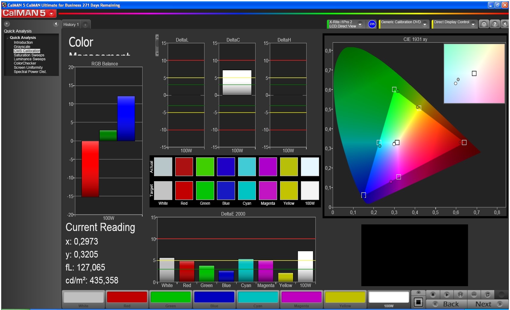 随着卡尔曼5软件的帮助下,我们确定的颜色精确度,饱和度和灰度演示。我们的审查单位的RGB平衡显示偏蓝,这也导致弱红色的颜色。 DeltaE值5可以看出,所有的颜色都在可接受的区域价值。这也支持了准确的色彩呈现的主观印象。