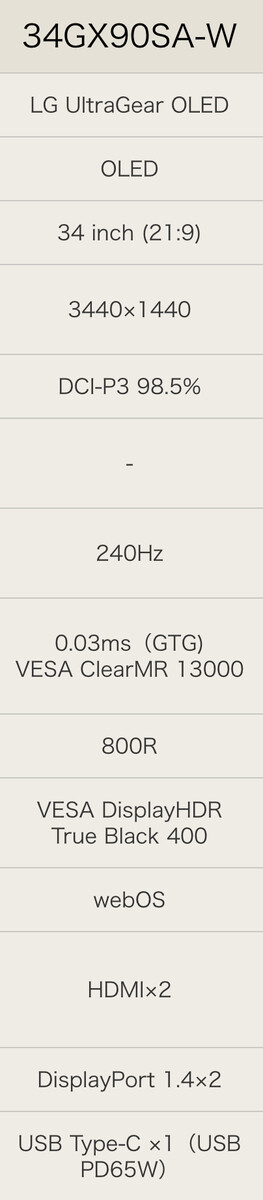 现在,DisplaySpecifications和Prad.de等媒体报道了 LG 在一个日语微型网站上分享了 UltraGear OLED 34GX90SA 的早期细节。从表面上看,UltraGear OLED 34GX90SA 似乎与去年的 UltraGear OLED 34GS95QE(亚马逊当前售价 799.99 美元)。同样,前者的原生分辨率为 1440p,刷新率为 240 Hz,GtG 响应时间为 0.03 ms。