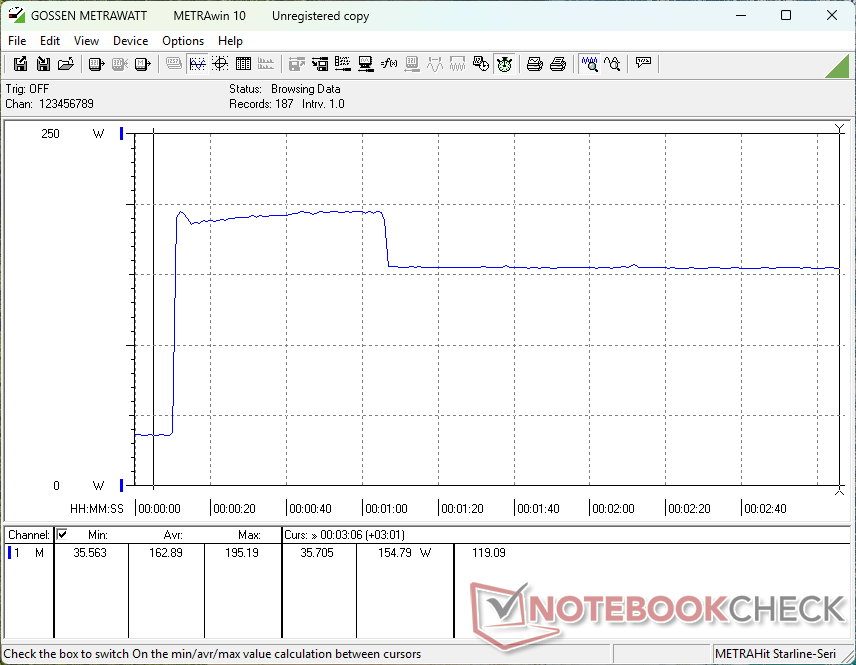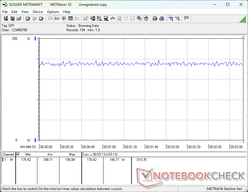 对于 RTX 5060 笔记本电脑来说,整体功耗要求相当高,因为大多数采用相同 GPU 的其他笔记本电脑通常不会配备 Core-HX 系列 CPU。例如,Alienware 16 Aurora 在运行《赛博朋克 2077》时的功耗仅为 123 W,而我们的功耗为 188 W。 Razer Blade 16Razer Blade 16 配备了性能更强的 RTX 5080 GPU,与我们的Legion 7 16 相比,只需多消耗 4% 的电能,游戏性能就能大幅提升 60% 至 90%。