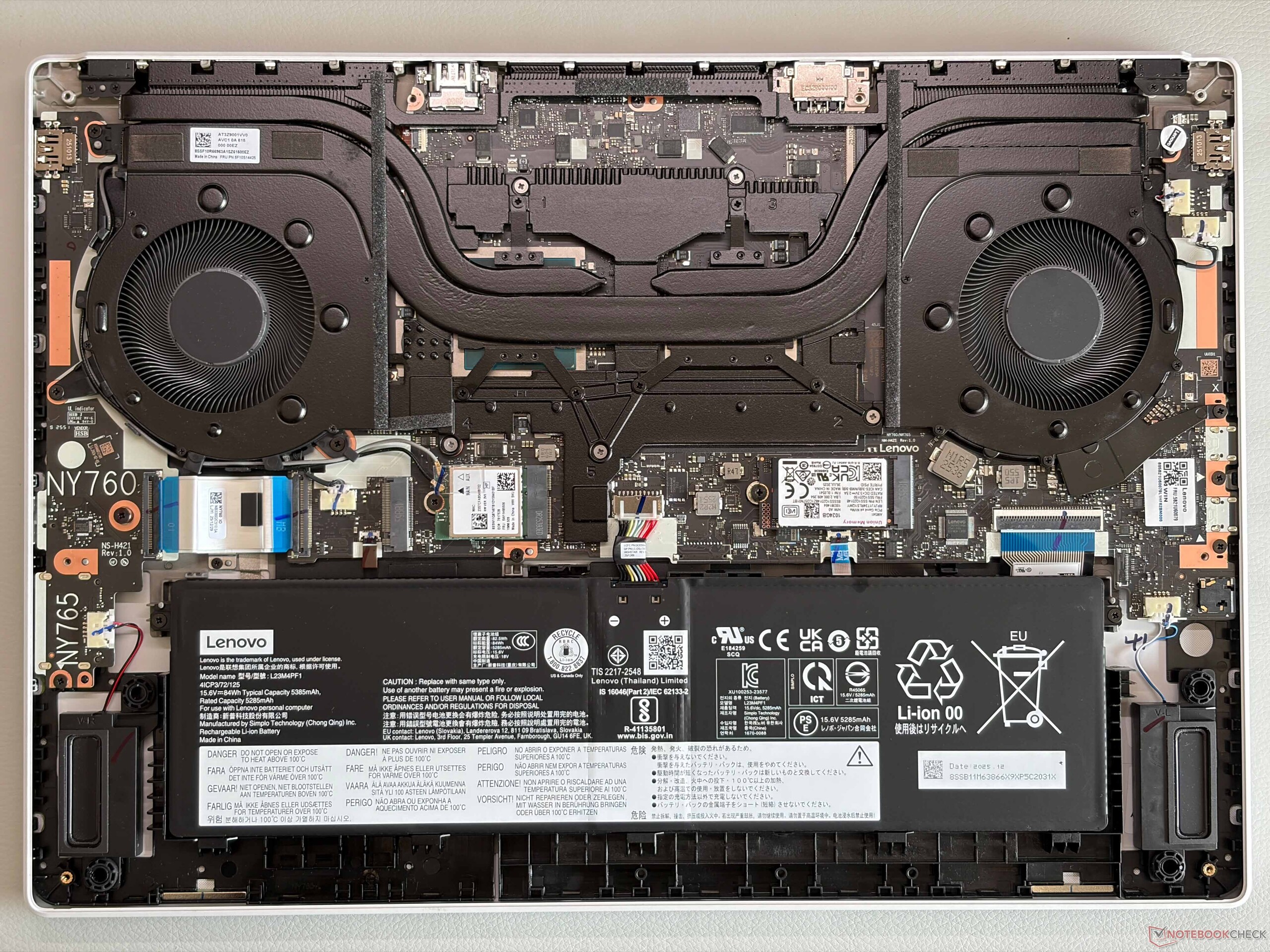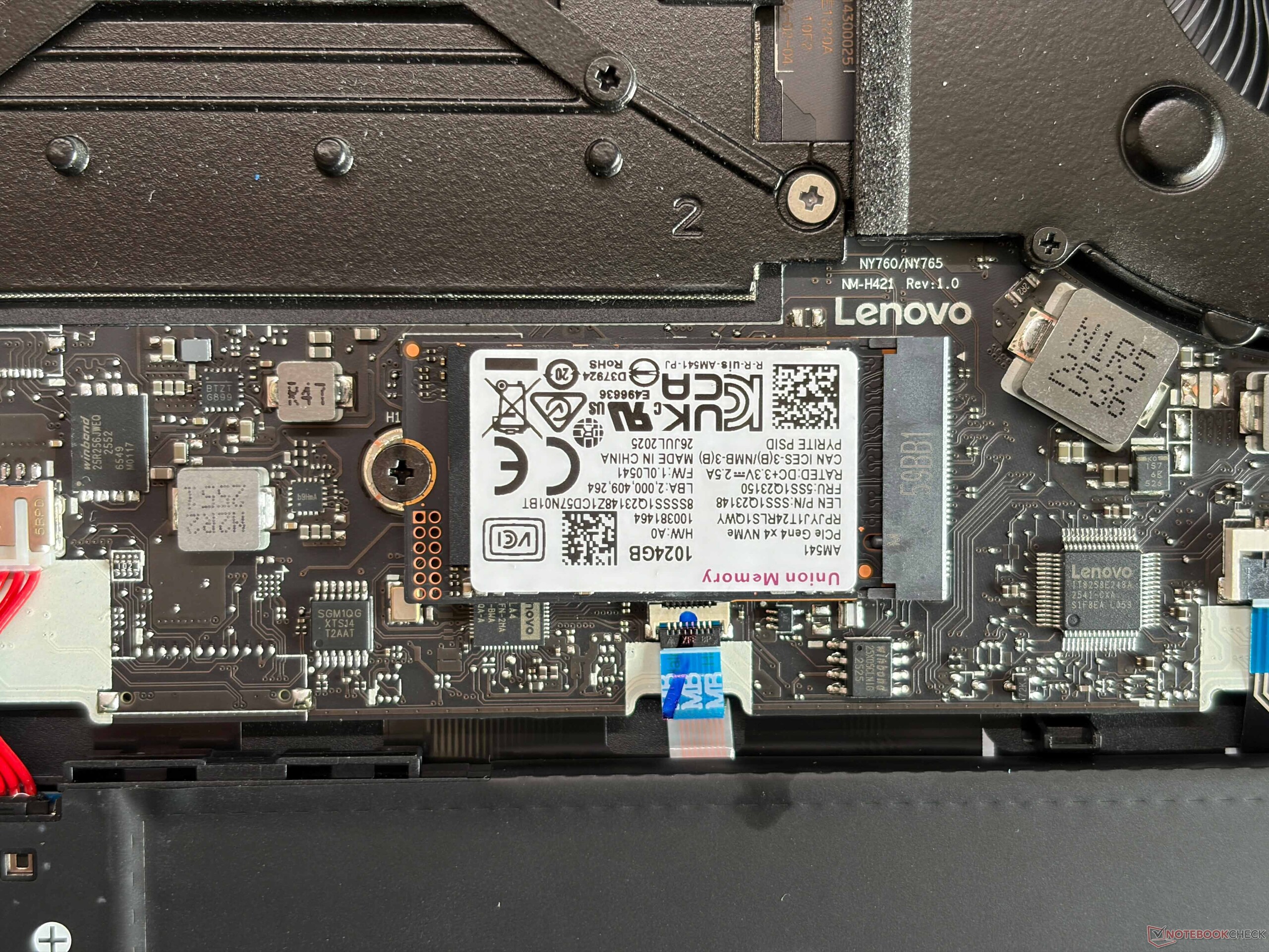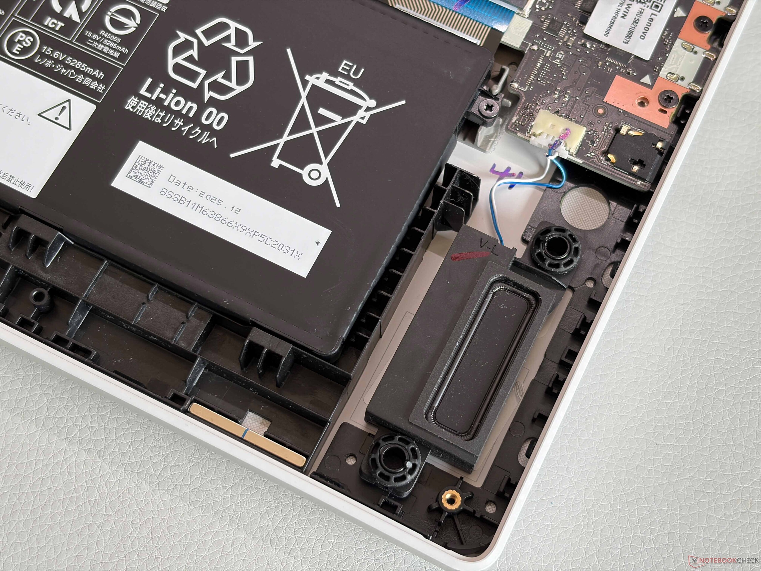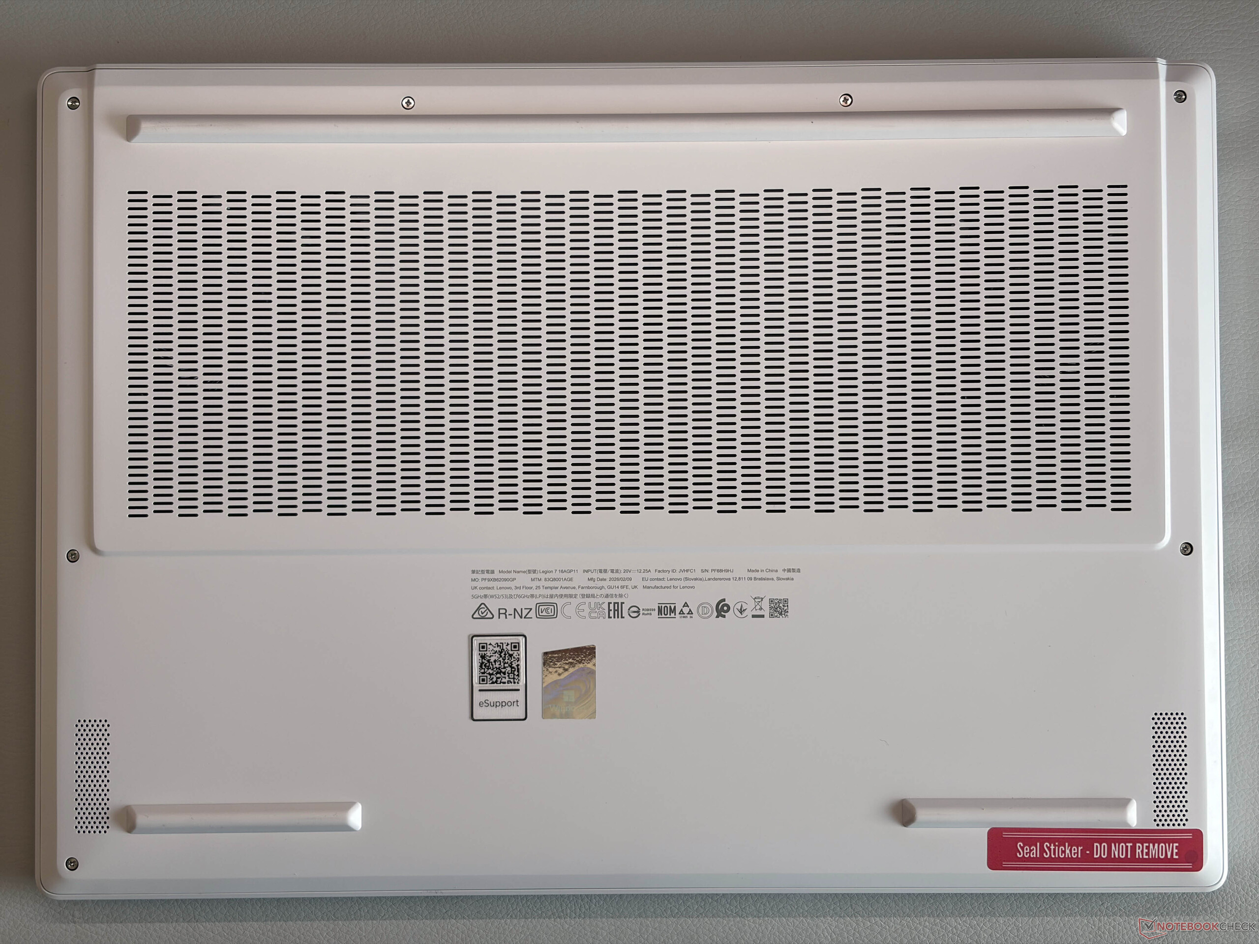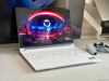我们的白色评测机看起来非常漂亮,铝制表面不会吸附指纹或灰尘,因此非常容易保持清洁。照明元素保持在最低限度。重量的减轻并没有影响稳定性,AMD 的新机型和以前一样坚固。铰链(最大开启角度为 180 度)也调整得很好,将弹跳降至最低。维护选项仅限于 M.2-2242 固态硬盘、一个空闲的 M.2-2280 插槽、Wi-Fi 模块以及风扇的清洁,而内存是焊接的。