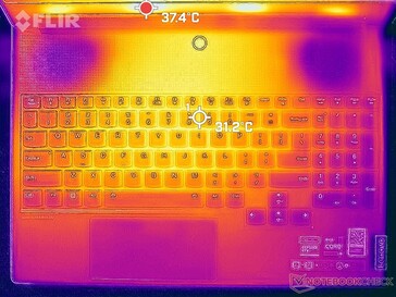 尽管采用了先进的散热片,但表面温度还是相当高。游戏时,WASD 键和键盘中心的温度分别高达 42 摄氏度和 46 摄氏度,比我们在 Alienware x16 R1.许多其他游戏笔记本电脑(如 Razer Blade 16)都会从 WASD 键吸入新鲜空气,以保持键盘部分的凉爽,从而让游戏更舒适,但我们的Legion 9 16 却不是这种情况,下面的温度图就说明了这一点。