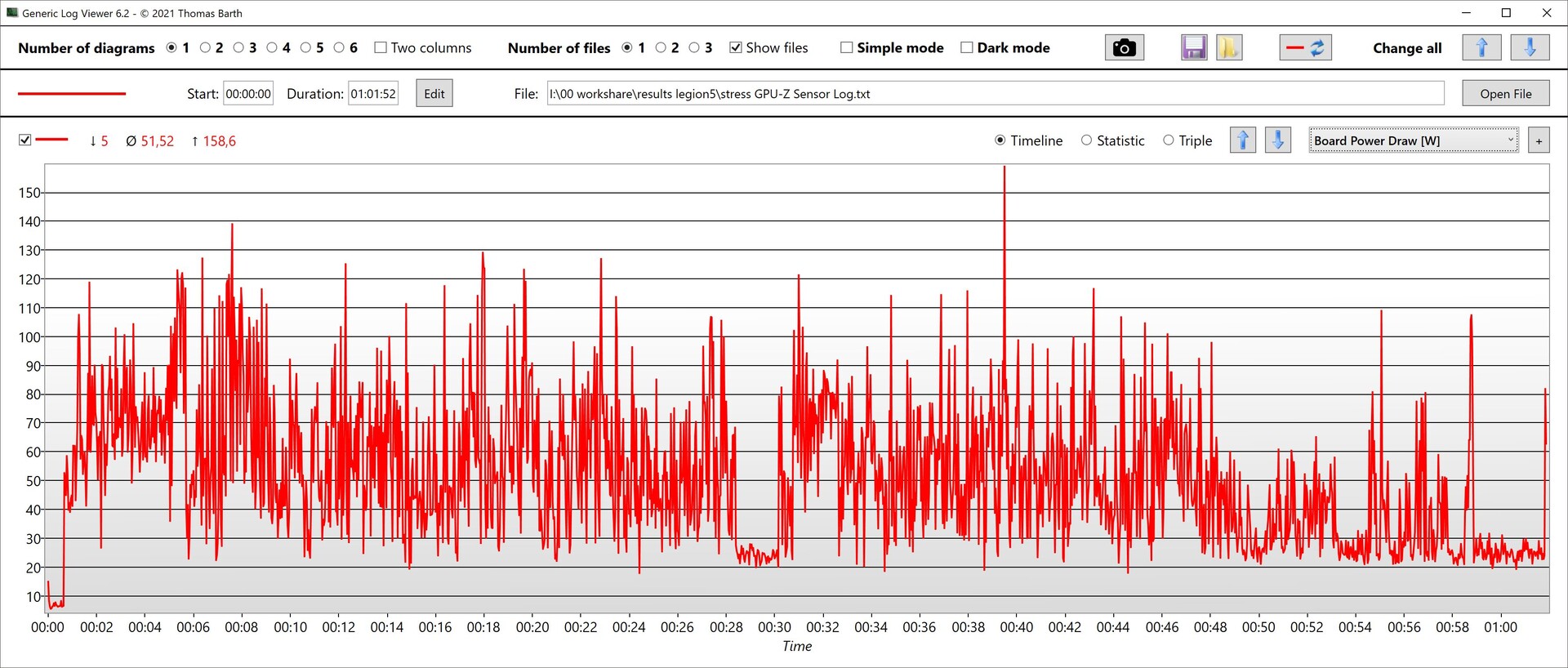 要测量Legion Pro 5 的真实闲置功耗并非易事,因为这款笔记本电脑几乎持续不断地从插座中消耗约 50 瓦的功率,即使在闲置状态下也是如此!如果等待很长时间,其闲置功耗最终会降低到相对正常的数值(15 至 20 瓦),但只要用 F 键改变笔记本电脑的亮度,其功耗就会回升到 50 瓦,而且会持续很长时间。因此,表中给出的空闲值相当低。
