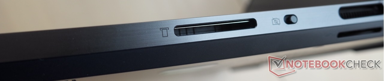尽管没有 RJ45 端口,但 Slim 7 提供了丰富的连接功能。右侧有一个中速读卡器和一个用于网络摄像头的隐私快门。左侧有一个音频插座和两个 USB 端口(1 个 USB 4、1 个 USB 3.2 Gen2),均支持 DisplayPort 1.4 和 140 瓦功率输出。此外,还有一个 HDMI 2.1 端口,最多可连接三个外部显示器。机身后部有三个 USB 3.2 Gen2 端口,并可连接附带的 230 瓦电源装置。