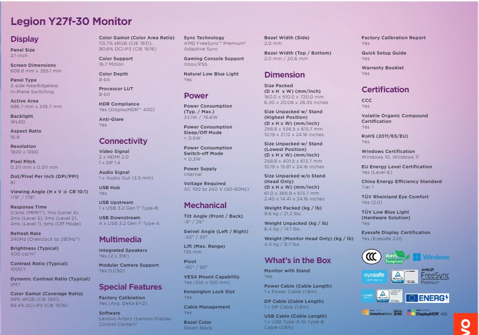 最后但并非最不重要的是,Legion Y27f-30/Y27qf-30在工厂进行了校准,声称其Av.Delta E小于2。