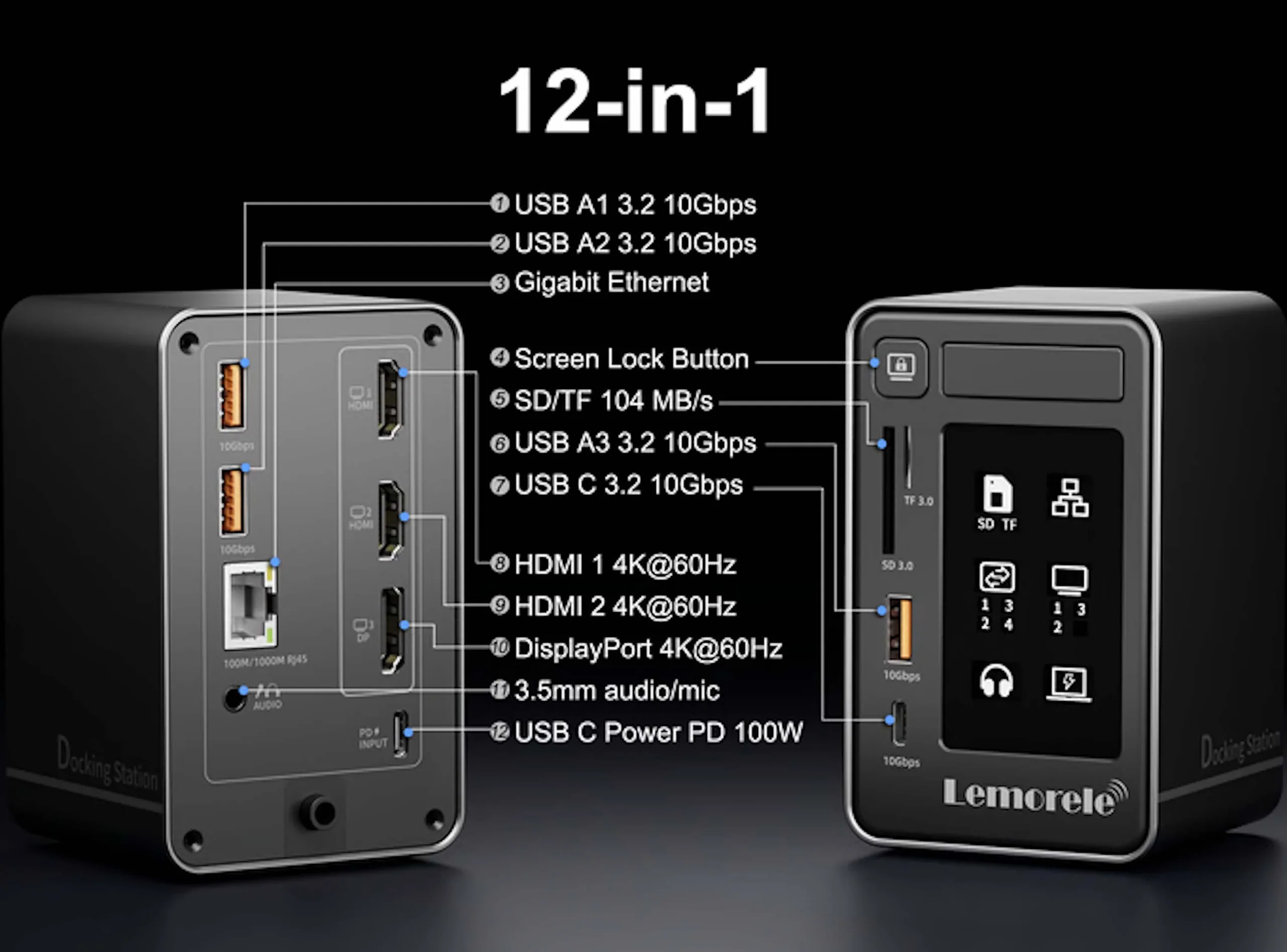 Lemorele TC1000:可连接三台 4K 显示器的 12 合 1 扩展坞成本不高