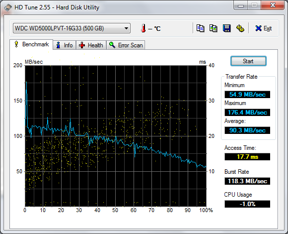 由于操作系统是西数的硬盘,我们使用HDTune的一个适当的基准,以评估存储设备的速度。平均传输速率被证明是一个更好的结果实现了由传统的硬盘驱动器。随着平均值90.3 MB/ s时,大量的数据处理愉快快(和4%的速度比在IdeaPad U310 - 开本13的SSD工作快两倍)。提升SSD可能有助于176.4 MB/ s的最大速率是有限的,但其专业领域的阅读和写作小文件(这就是为什么它被使用,例如,在启动笔记本电脑时)。