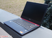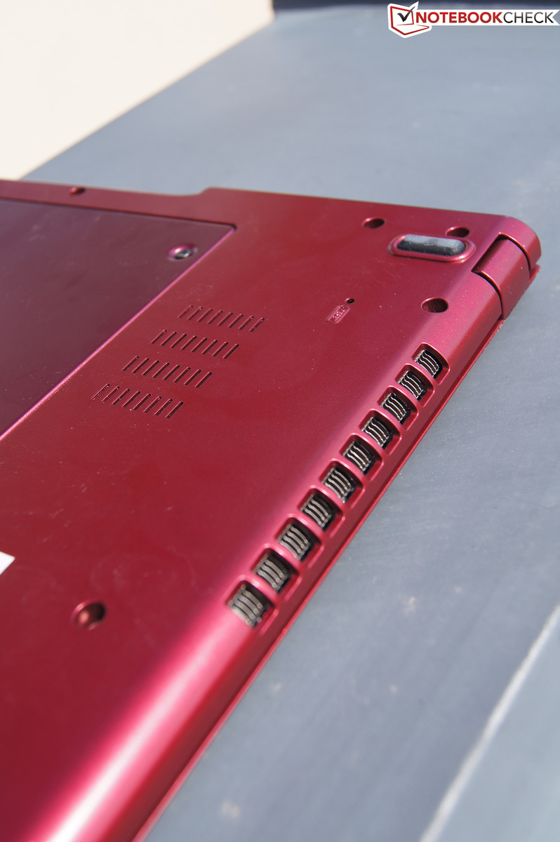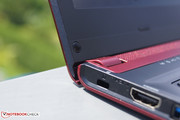 The case is manufactured very well and feels agreeably soft. The edges and corners are ergonomically flattened in important places. Opening the device also proves to be very easy even with one hand. The lid can be opened to an angle of 145° and is held firmly by the two small hinges without rocking noticeably. The ruby-colored lid and base alternates with matte black on the input field. Their surface does not look as rubberized as do various ThinkPads, but is rather smooth. The designers considered usability here: The interfaces on the sides are marked on the top's right and left edge so that they are easily found.
