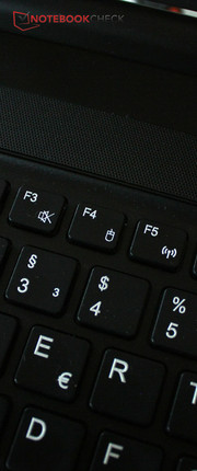 Typing on the normal sized keys (width of 1.2 cm) is quite good. Small travel and the well-adjusted resistance contribute to that. The generous spacing of 3 millimeters between the keys also helps to hit the correct key. The layout is slightly confusing because the "Break" and "Del" key are swapped. Special keys, for example for volume control, do not exist. These functions can be used with the help of the function keys "F1" to "F12".