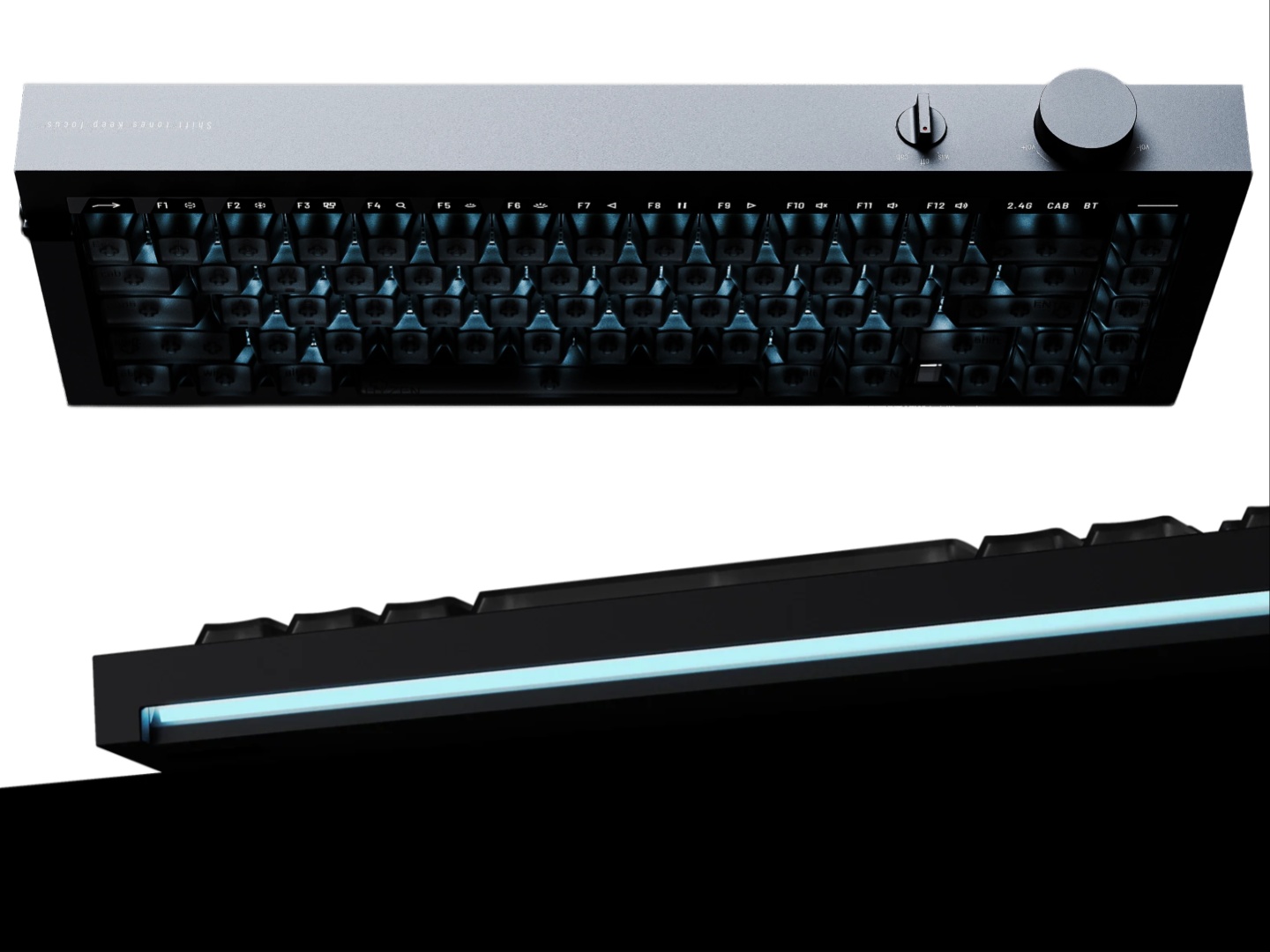在设计方面,机身由一整块铝合金经 CNC 加工而成。键盘的使用率为 65%,但通过专用的切换键和 LED 指示灯巧妙地整合了功能行。还有一个用于音频控制的旋钮和一个用于电源、有线和无线模式的三向拨动开关。虽然底部没有脚垫,但 Lofree 增加了一个 12 度的倾斜角度,使打字姿势更符合人体工学。Hyzen 底部还有一个朝下的 LED 灯条。