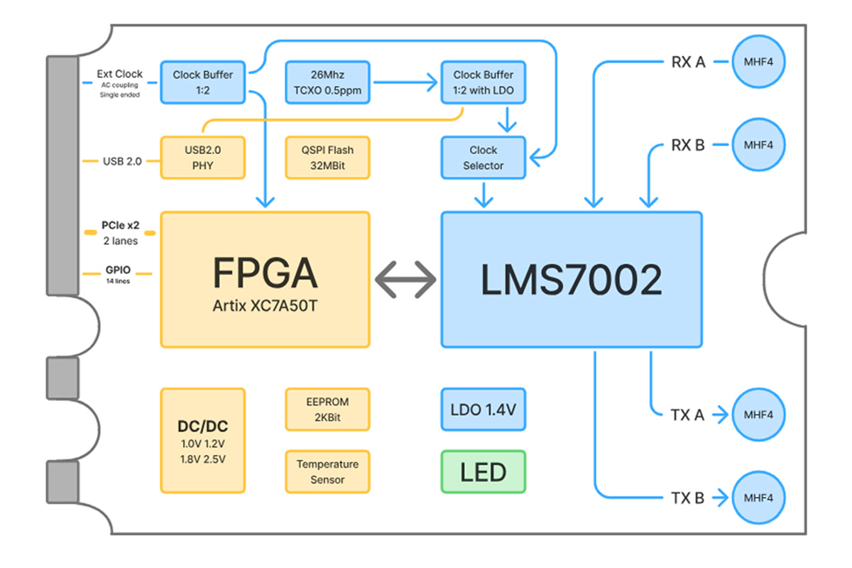 xSDR 的核心是基于 Lime Microsystems LMS7002M 射频收发器和 AMD Artix-7 XC7A50T FPGA。这一组合覆盖了 30 MHz 至 3.8 GHz 的调谐范围。SDR 在 SISO 模式下支持 0.1 MSPS 至 122.88 MSPS 的采样率,在 MIMO 模式下支持超过 80 MSPS 的采样率,信道带宽为 0.5 MHz 至 90 MHz。四个 MHF4 天线连接器可接入两个 RX 和两个 TX 信道。