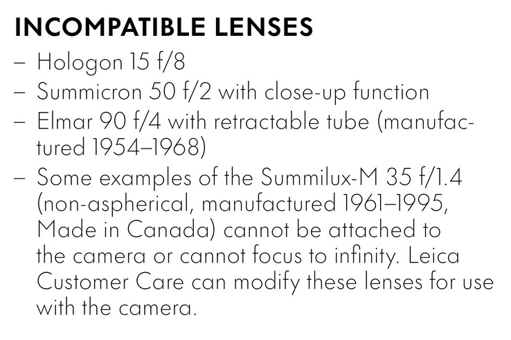 这款相机兼容几乎所有高品质的徕卡 M 镜头。可追溯到 1954 年。徕卡镜头具有自己独特的图像特性,可以帮助摄影师创作出与使用其他镜头拍摄的照片截然不同的图像。