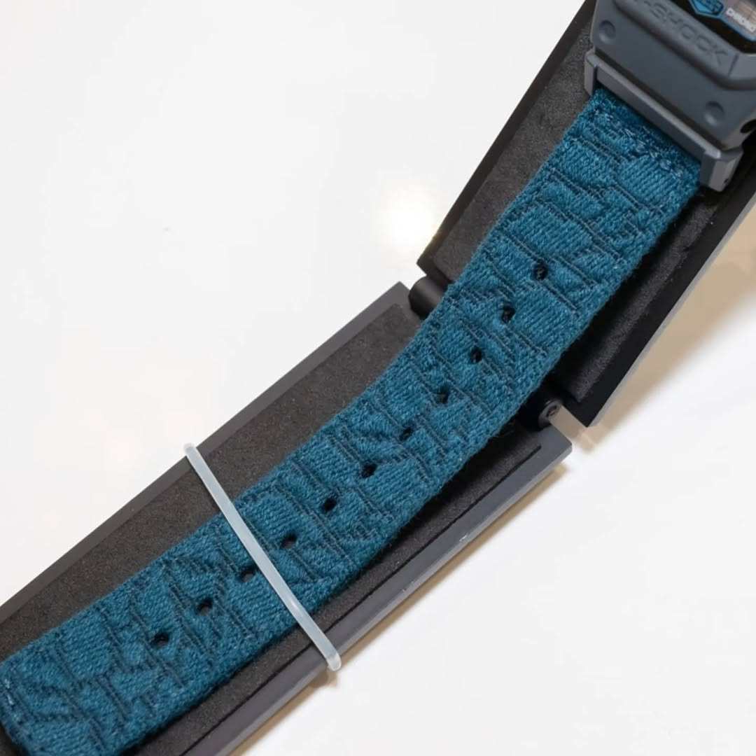 这款手表的设计以可持续发展为核心,与之相关的 "Untangle It "倡议也体现了这一点。表圈和表壳使用生物基树脂,而表带则由回收渔网制成的布质横带组成。特写照片显示,深海军蓝或茶色的织物上有重复的几何纹理图案,看起来就像海洋表面。这种材料的选择与大多数 5600 型号上的标准树脂表带截然不同。如果不是因为 MIP 显示屏,它很容易成为这款手表的最大卖点之一。