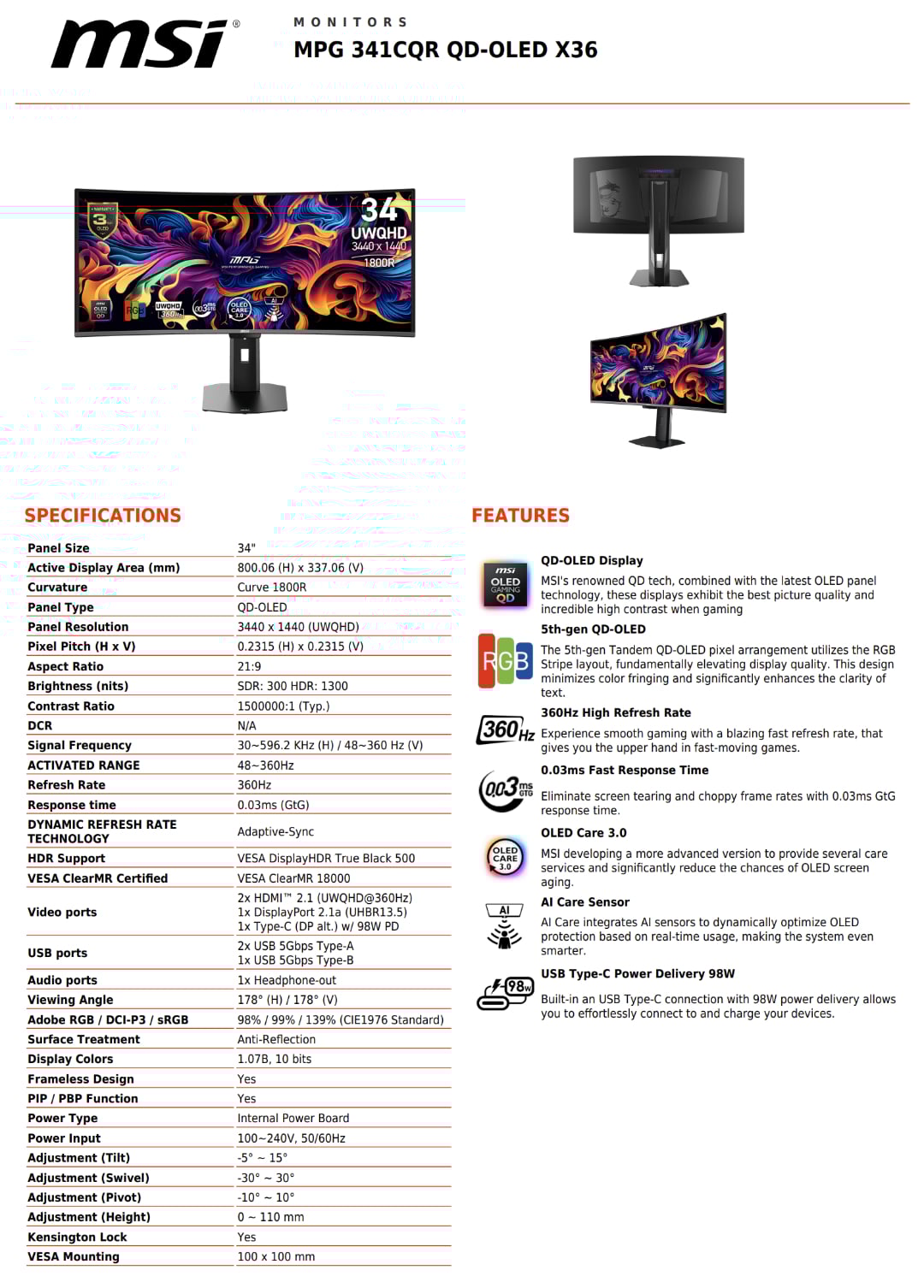 微星 MPG 341CQR QD-OLED X36 是三星显示器最新 QD-OLED 面板技术的又一早期范例。目前,宏碁、华硕和惠普也都采用了这种第 5 代面板。换句话说,MPG 341CQR QD-OLED X36 的核心特性与 掠夺者 X34 FE, HyperX Omen 34 英寸 OLED 360 Hz 游戏显示器和 ROG Swift OLED PG34WCDN分别如下: