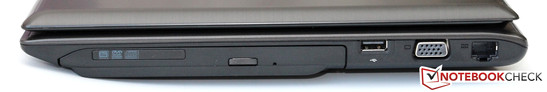 Compared to the GE60, the CX61 loses one USB port and comes with 3 USB ports total (2x USB 3.0 left, 1x USB 2.0 right). The rest is pretty standard fare: VGA, HDMI and GBit LAN. We would have liked to see a DisplayPort included, as HDMI can't always handle high-resolution 27 and 30-inch LCD displays well. We do appreciate the separate audio jacks - instead of a combo headphone/microphone jack - and the accessibility of the ports (although MSI could have put a bit more distance between some of the ports).