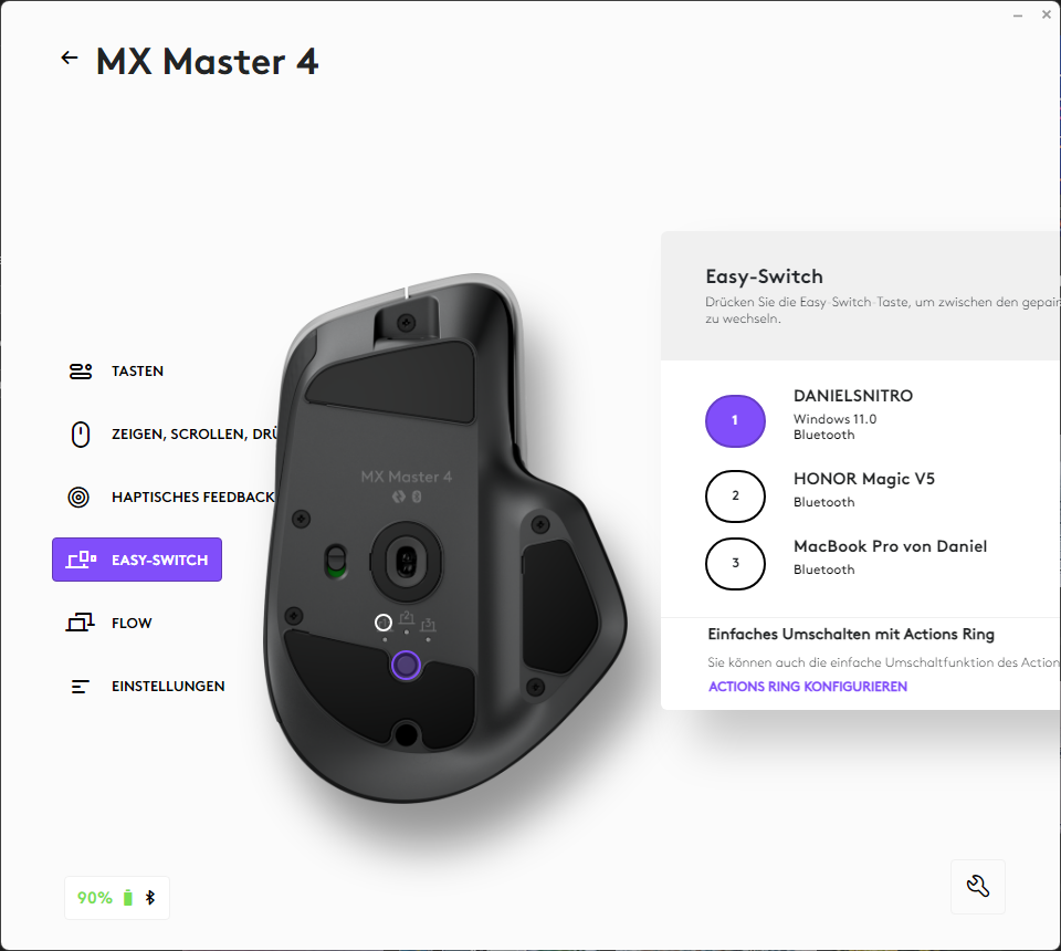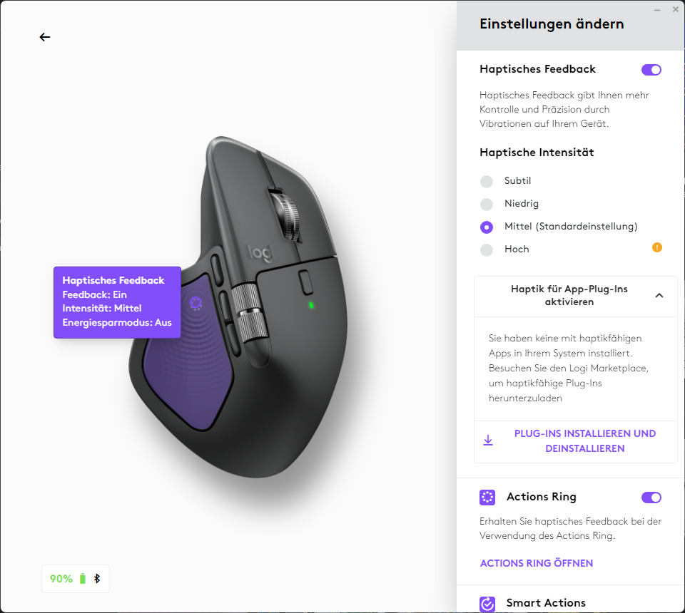 基本连接可在数秒内建立,因此鼠标可以立即使用。要享受全部功能,我们建议安装免费的 Logi Options+ 软件,该软件尤其可用于配置动作环。该环上的圆形菜单可快速访问多达 8 个可编程快捷键,使在 Adobe Photoshop、Zoom 或 Office 等复杂应用程序中的导航和工作变得明显更容易。软件设计目前仍处于测试阶段,但在评测过程中已经证明非常可靠。