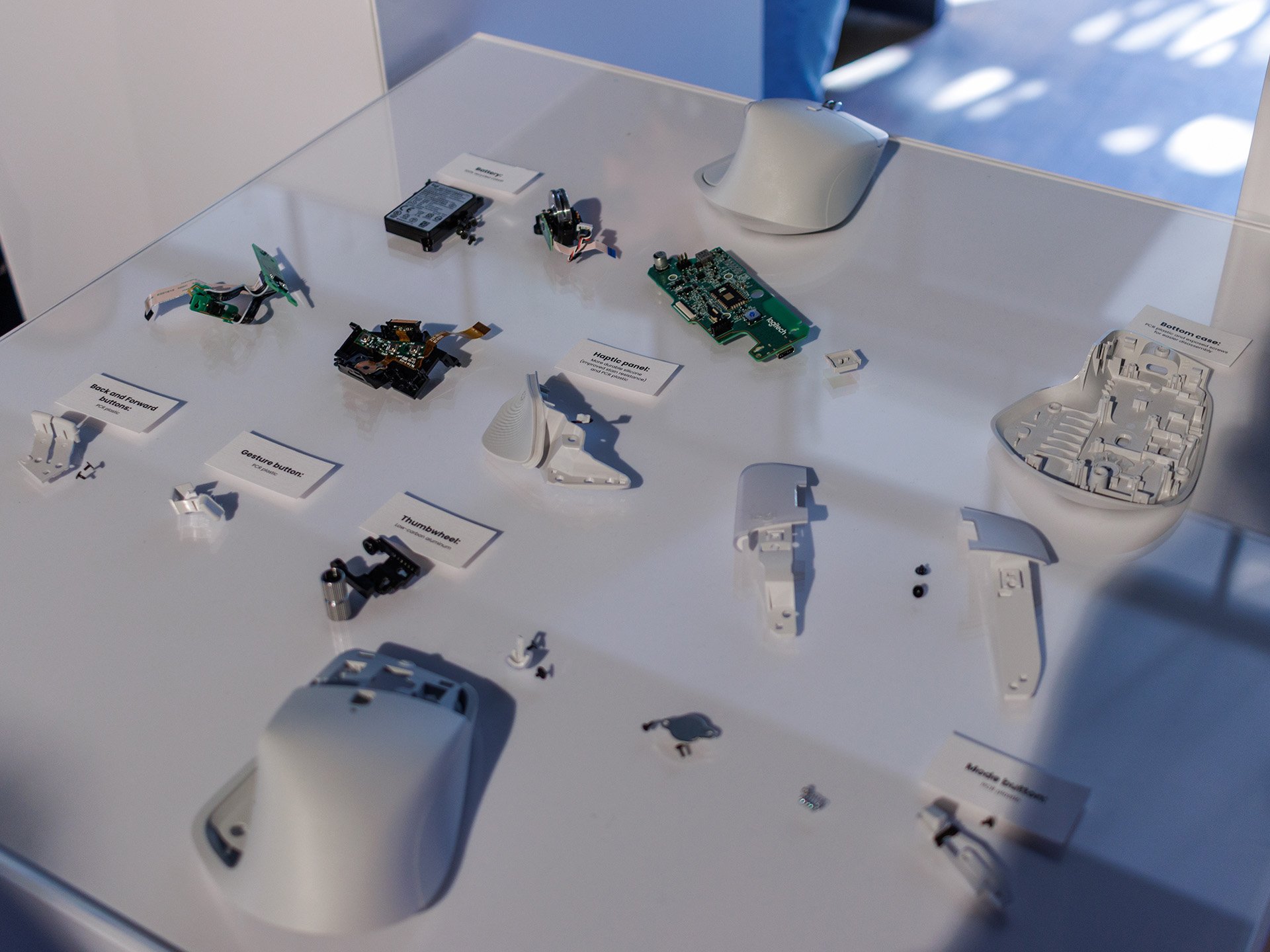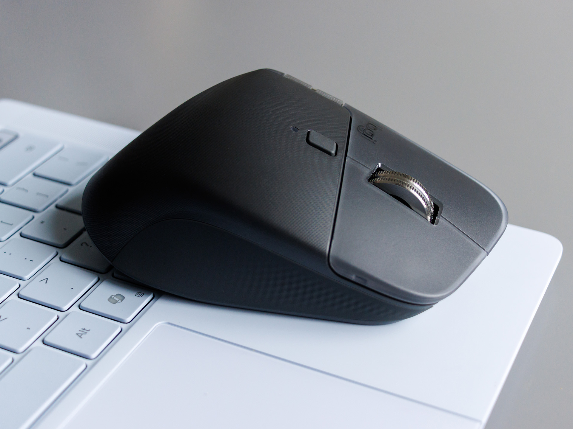 罗技 MX Master 4 采用了高品质的材料:外壳主要由再生塑料制成,而拇指滚轮和主滚轮则由坚固的铝合金制成。