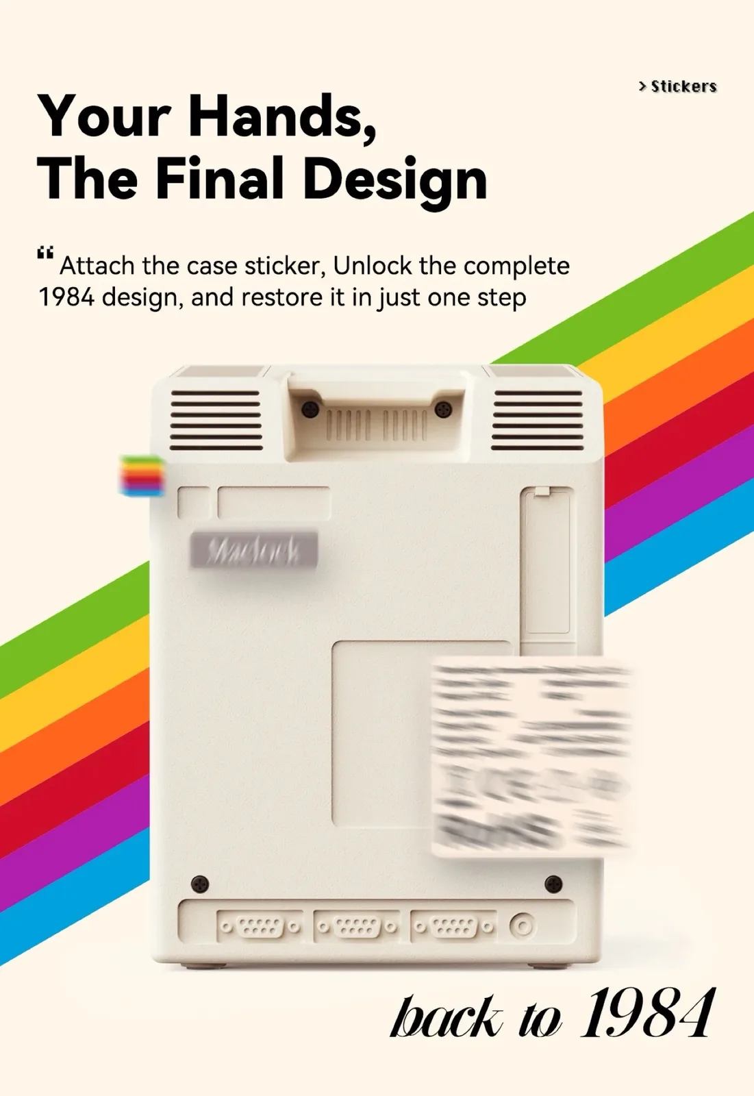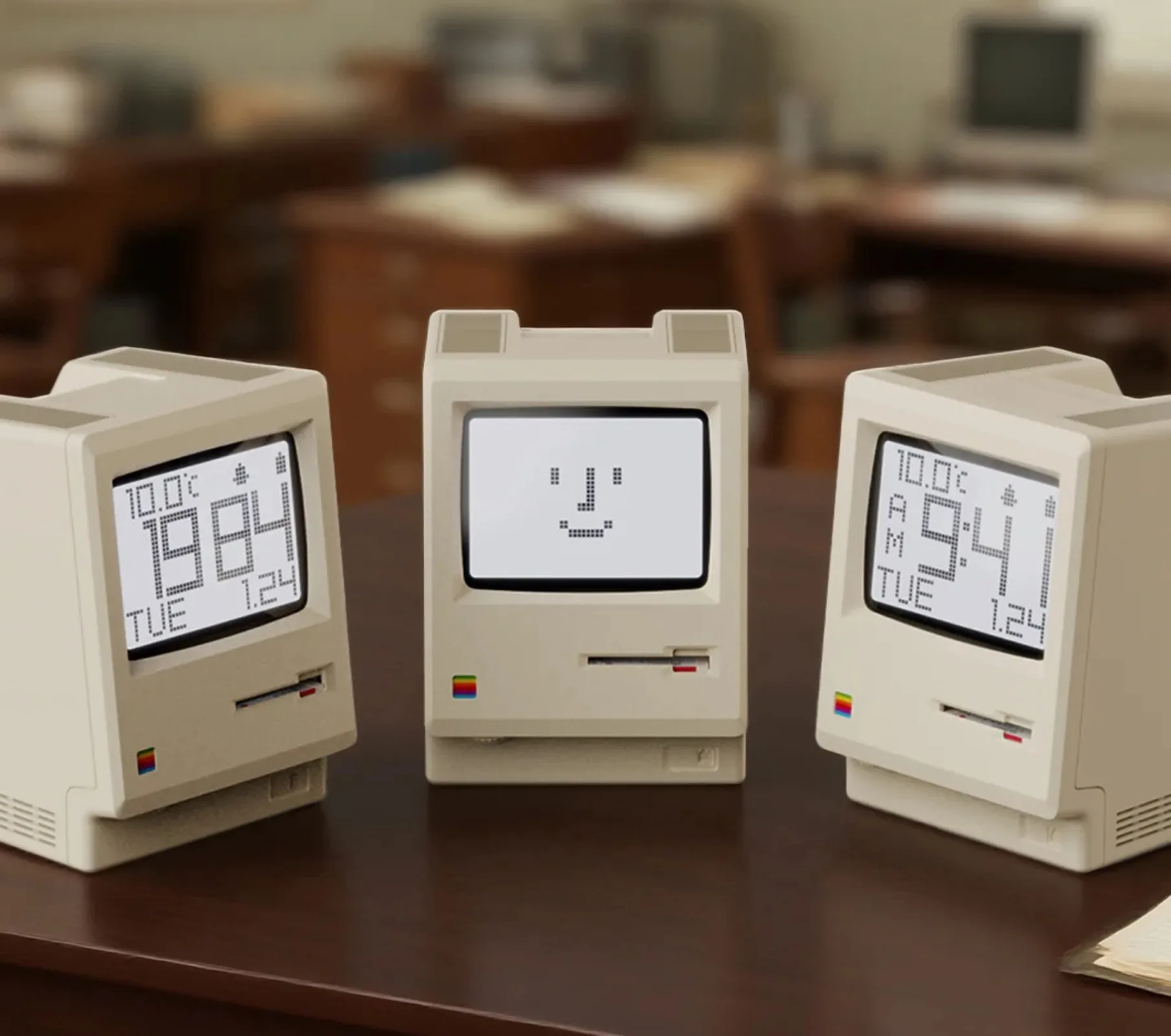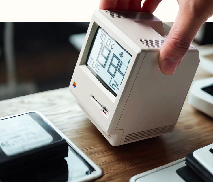 Kokogol Maclock 以 1984 年的第一台 Macintosh 为原型。设计非常细致:虽然出于版权原因,1980 年代的彩色Apple 徽标不得不换成彩色正方形,但数字时钟仍显示 MacOS Finder 特有的界面。