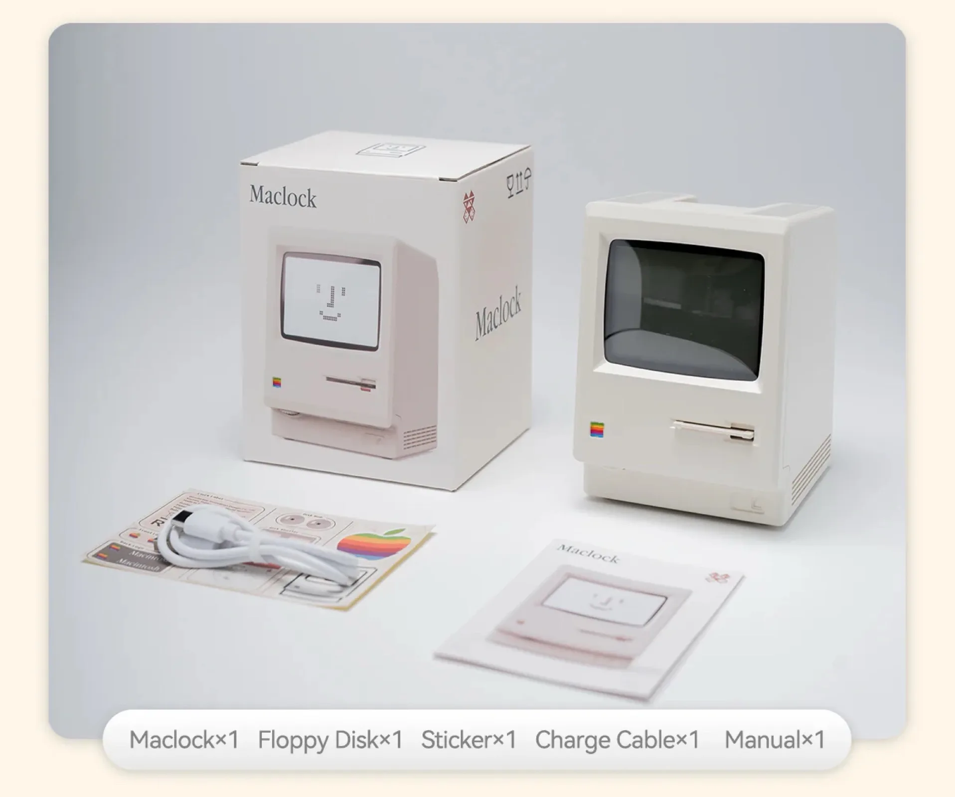 显示屏默认显示时间和日期,但 Maclock 也可用作闹钟。数字钟的外壳尺寸为 8 x 9.1 x 11.2 厘米。外壳背面的贴纸必须由购买者自行粘贴。Kokogol Maclock 只限量生产,一旦售罄,将不再供应。