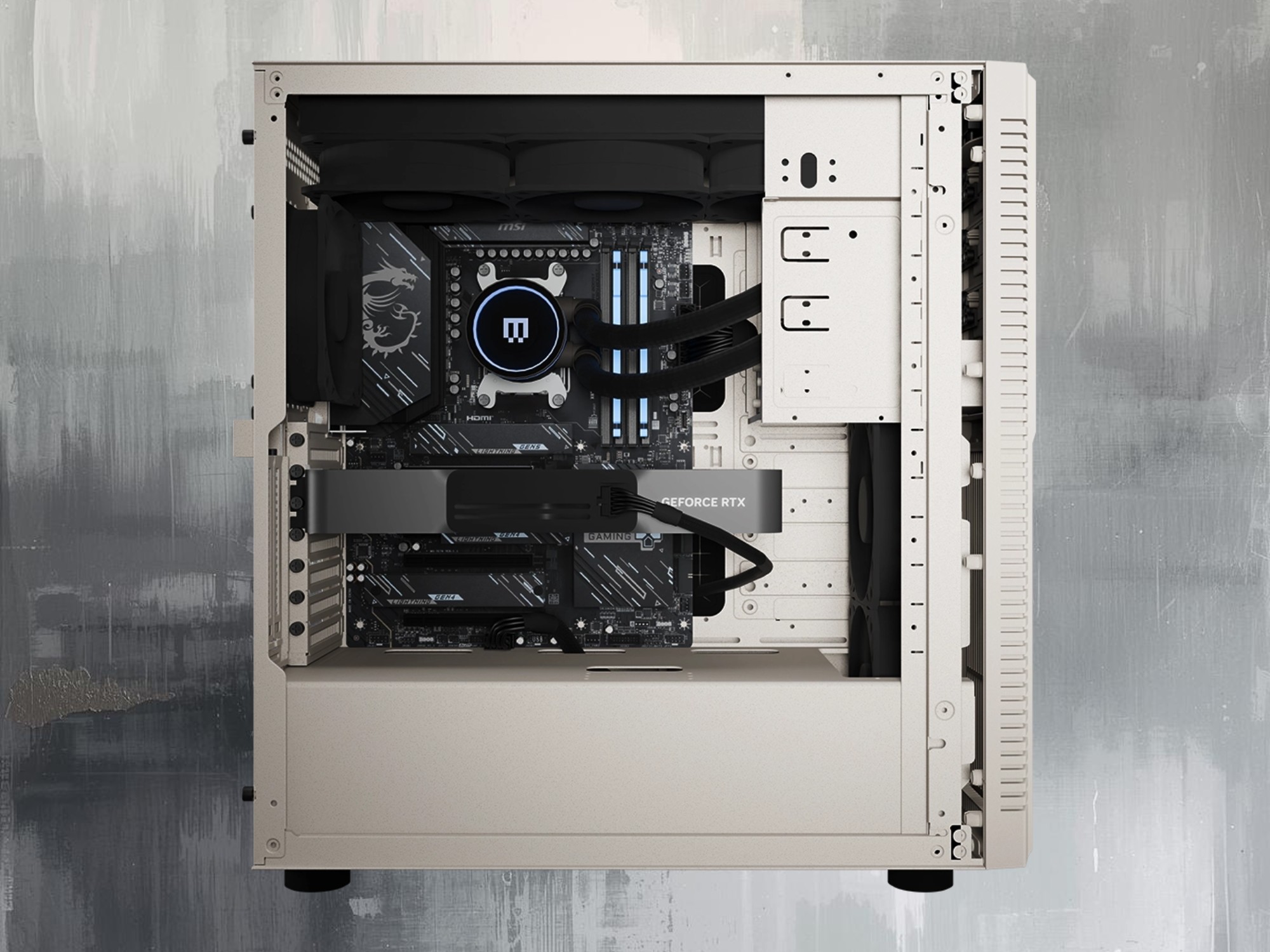 上的防扭结线圈,以及 5.25" 硬盘托架空间中引以为豪的泵/内存组合,每一个细节都像是