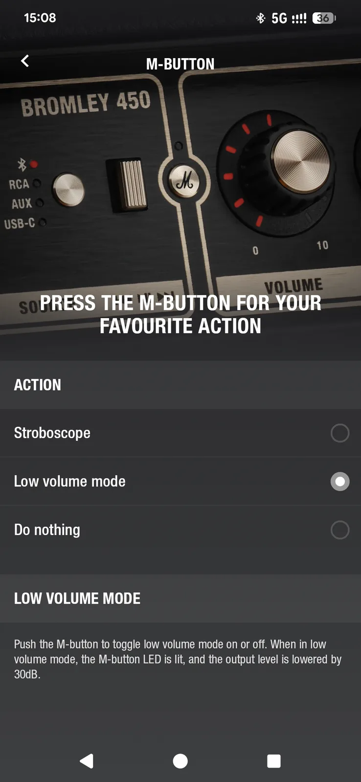 对于较安静的环境,如阳台或较轻松的环境,有一个低音量模式,可将输出降低 30 分贝。如果需要,您可以将此功能分配给 M 按钮。
