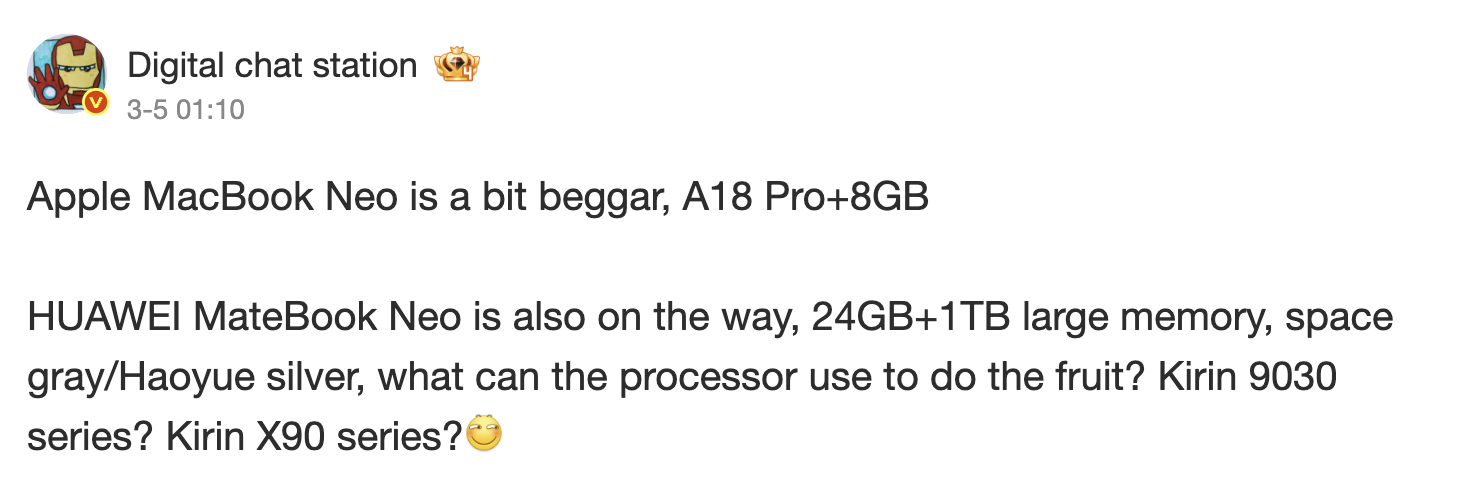 此外,麒麟 9030 Pro 还将为 MateBook Neo 提供高达 24 GB 的内存和 1 TB 的存储空间。相比之下,Apple ,MacBook Neo 只提供 8 GB 统一内存和 256 GB 或 512 GB 存储空间。请参阅 我们的 MacBook Neo 发布文章有关Apple 廉价 MacBook 的更多详情。