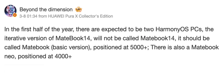 据报道,华为计划推出一款名为 MateBook Neo 的直接替代产品。Digital Chat Station 在一月份首次提到,MateBook Neo 可能会与更新的 MateBook 14 一起出现。但具体时间仍有待观察。不过,Hyperdimensional Realm 预计华为 MateBook Neo 的售价约为人民币 4,000 元(约合 575 美元),起步价比下一代 MateBook 14 便宜约人民币 1,000 元(约合 145 美元)。